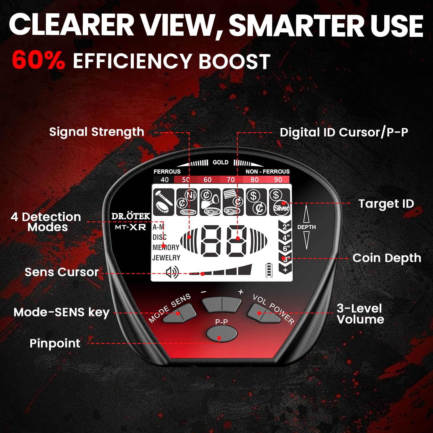 DR.ÖTEK Metal Detector for Adults Waterproof, Professional Gold Detector Kit with High Accuracy, 10" IP68 Coil, Backlight LCD Display, 5 Modes, Advanced DSP Chip for Treasure Hunting, MTXR-Red
