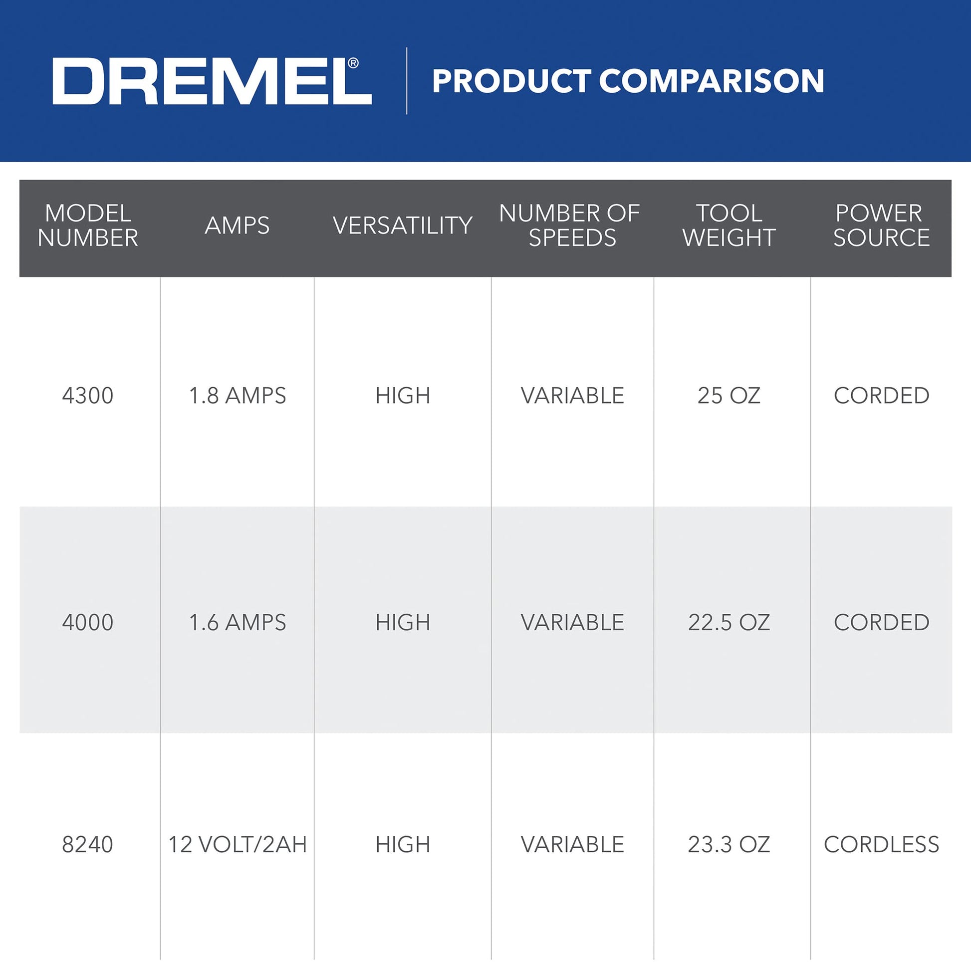 Details: Endless possibilities, one tool. From sanding to grinding, and routing to cutting; the Dremel 4300 produces power from job to job. The 4300 is the first Dremel rotary tool to allow tool-less and collet-less accessory changes with the inclusion of the keyless chuck. The chuck accepts all Dremel accessory shank sizes for fast and convenient accessory changes without ever using a wrench. Featuring the all new Pivot Light, your projects are well-lit with an optimum line of sight since the light pivots to direct illumination where you want it. Experiencing the full range of Dremel rotary tool applications is easier than ever because the 4300 offers our most powerful motor with built-in variable speed and electronic feedback circuitry. And the slim, ergonomic body design provides a comfortable 360-degree grip zone no matter how you hold it for extended ease of use. The completely redesigned airflow system lets the Dremel 4300 run cool, quiet, and smooth so completing projects are more enjoyable than ever. The Dremel 4300 is perfect for sharpening garden tools including lawn mower blades. This variable speed rotary tool is a wood engraver, metal engraver, glass engraver and etcher, detail sander, drill bit sander, and a micro drill