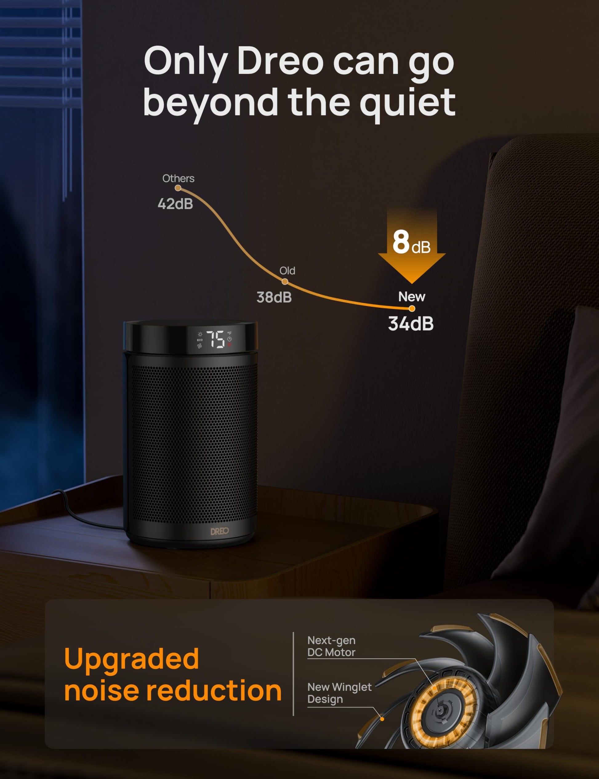 • Cozy quietness: No more choosing between quiet or warmth, Dreo's heater for bedroom warms quietly thanks to its brushless DC motor with frictionless performance and a winglet fan design that reduces turbulence, reducing noise to only 34dB.