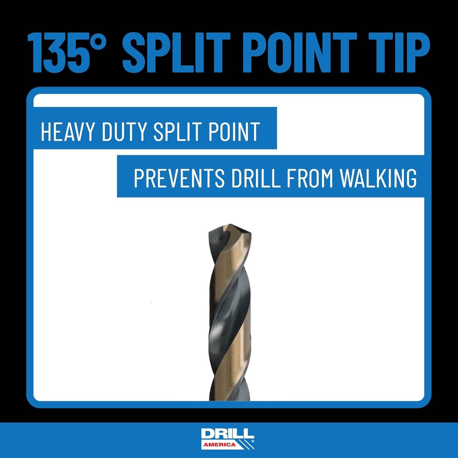 Details: Drill America KFD29J-PC KFD 29-Piece High-Speed Steel Drill Bit Set contains 29 high-speed steel KFD series Killer Force Drill Bits. Sizes 1/16' - 1/2' x 1/64' increments Sizes: 1/16', 5/64', 3/32', 7/64', 1/8', 9/64', 5/32', 11/64', 3/16', 13/64', 7/32', 15/64', 1/4', 17/64', 9/32', 19/64', 5/16', 21/64', 11/32', 23/64', 3/8', 25/64', 13/32', 27/64', 7/16', 29/64', 15/32', 31/64' and 1/2'. Drill America KFD29J-PC KFD Drill Set comes in a unique round drill index that combines form and function into 1 beautifully designed, easy to carry drill set. The shatter proof, water resistant case fits easily, anywhere you need it. Effortlessly grip the set in 1 hand as you would a travel coffee mug, leave it in the cup holder of your truck while on the way to your job or hang it on your belt when all hands are on deck. KFD Killer Force Drill Bits are manufactured from M2 premium grade high speed steel. For use in a wide range of materials in the iron and steel families such aluminum, iron, stainless steel and other hard metal drilling. KFD Killer Force Drill Bits have a 135 degree split point tip for self-centering and reducing thrust. Compared to a conventional 118 degree tip, these drills wont go 'walking' on you. KFD Killer Force Drill Bits are black and gold surface treated for use in stainless steel and other hard metal drilling.