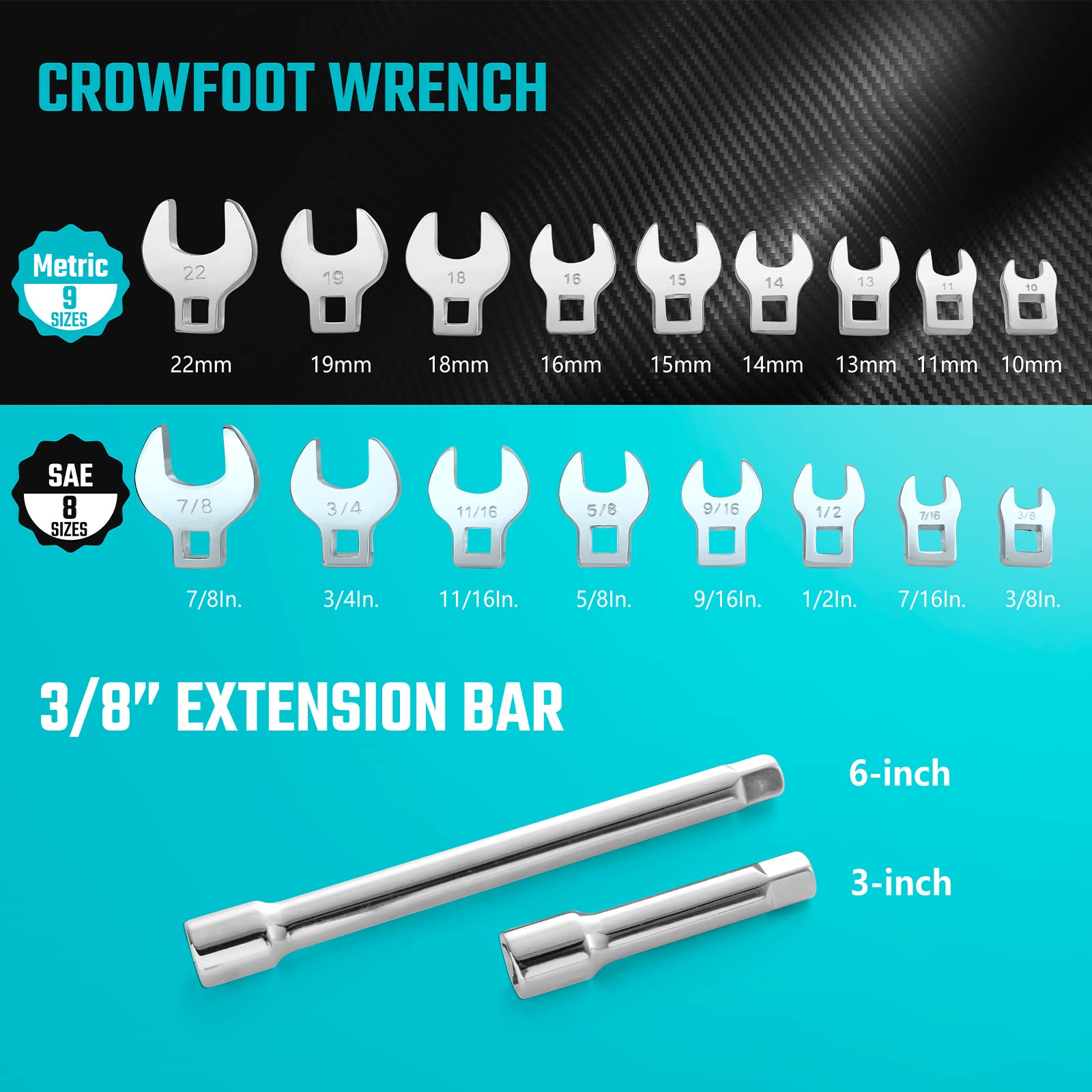 • 2 Extension Bars: This wrench set also includes 2 pcs 3/8 ' drive extension bars, one is in the length of 3 inch, the other is 6 inch. The spring-loaded detent ball offers firmly lock on the crowfoot wrenches, adding convenient reach in tight space