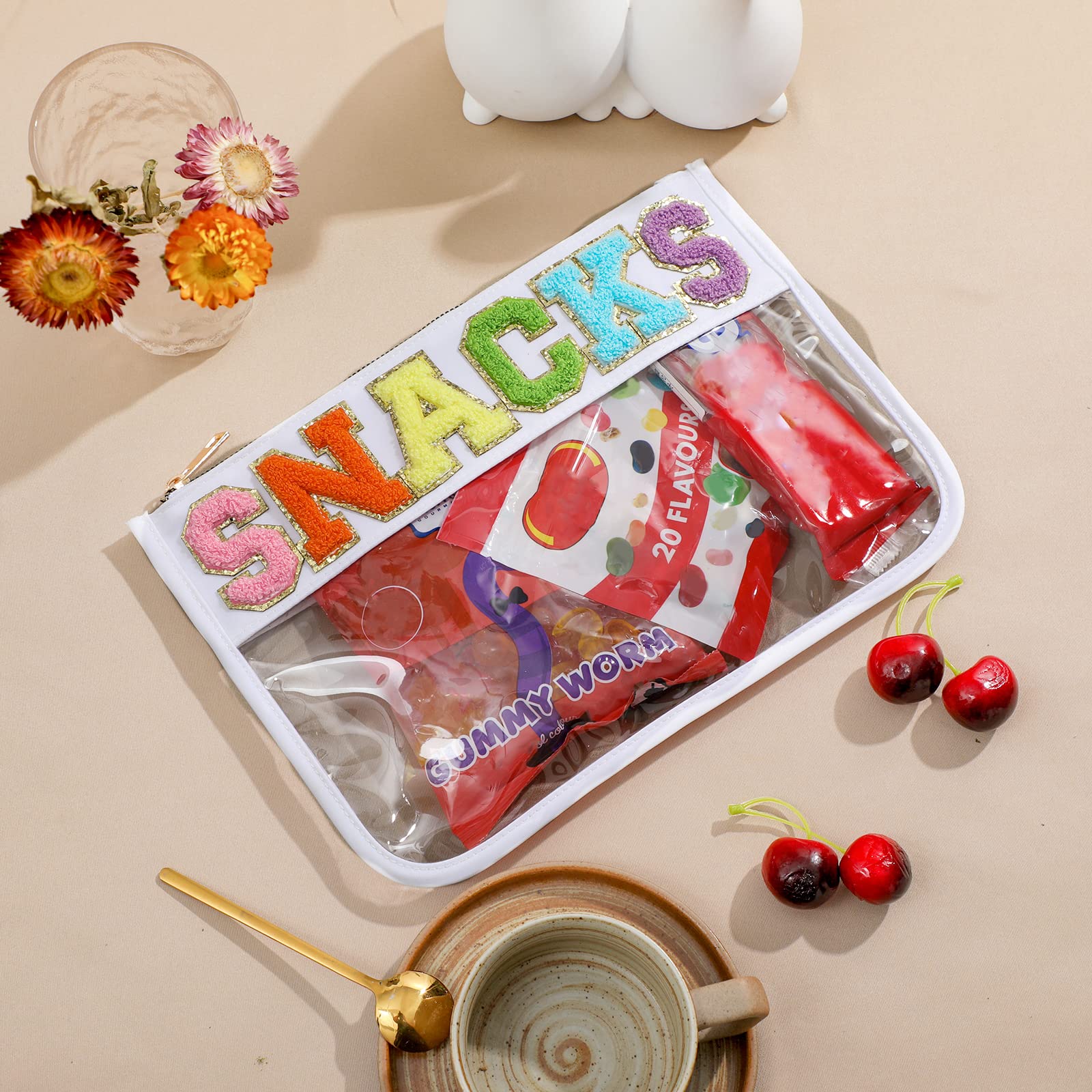 DYSHAYEN Snack Bag for Travel,Chenille Letter Clear Zipper Pouch,Nylon Clear Cosmetic Bag,Preppy Makeup Travel Bag for Women (White-Snacks)