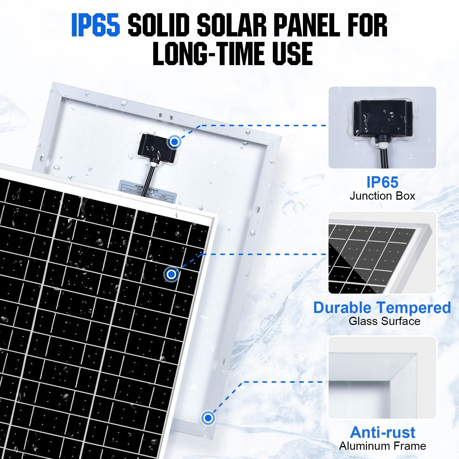 • [Durable & Reliable] Equipped with high-efficiency monocrystalline silicon cells, this 12V solar panel offers a long lifespan of up to 25 years and a low degradation rate of just 0.5% per year. Its low-iron tempered glass surface and corrosion-resistant aluminum frame ensure it is 100% waterproof and rustproof. It can withstand harsh weather conditions like sandstorms, strong winds, thunderstorms, blizzards, and hail, withstanding wind pressure up to 2400 Pa and snow load up to 5400 Pa.
