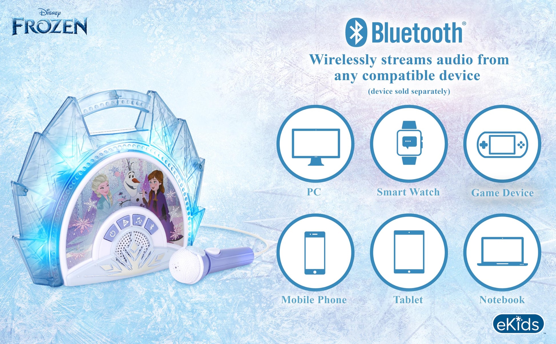 Details: The Disney Frozen Singalong Boombox makes a great gift for any fan of the popular film! Sing your heart out with this karaoke machine designed especially for girls who love to perform. Connect to any Bluetooth device and stream all your favorite songs. Use the real wired microphone to amplify your voice as you sing along to streaming music. Includes extended clips of the songs ‘Let It Go’, ‘In Summer’, and ‘For The First Time in Forever’. With cute graphics featuring Anna and Elsa, this karaoke speaker has all the inspiration you need to put on an amazing performance. Plus, a colorful light show adds to the fun. Visit the ekids brand store to explore even more gifts for girls!
