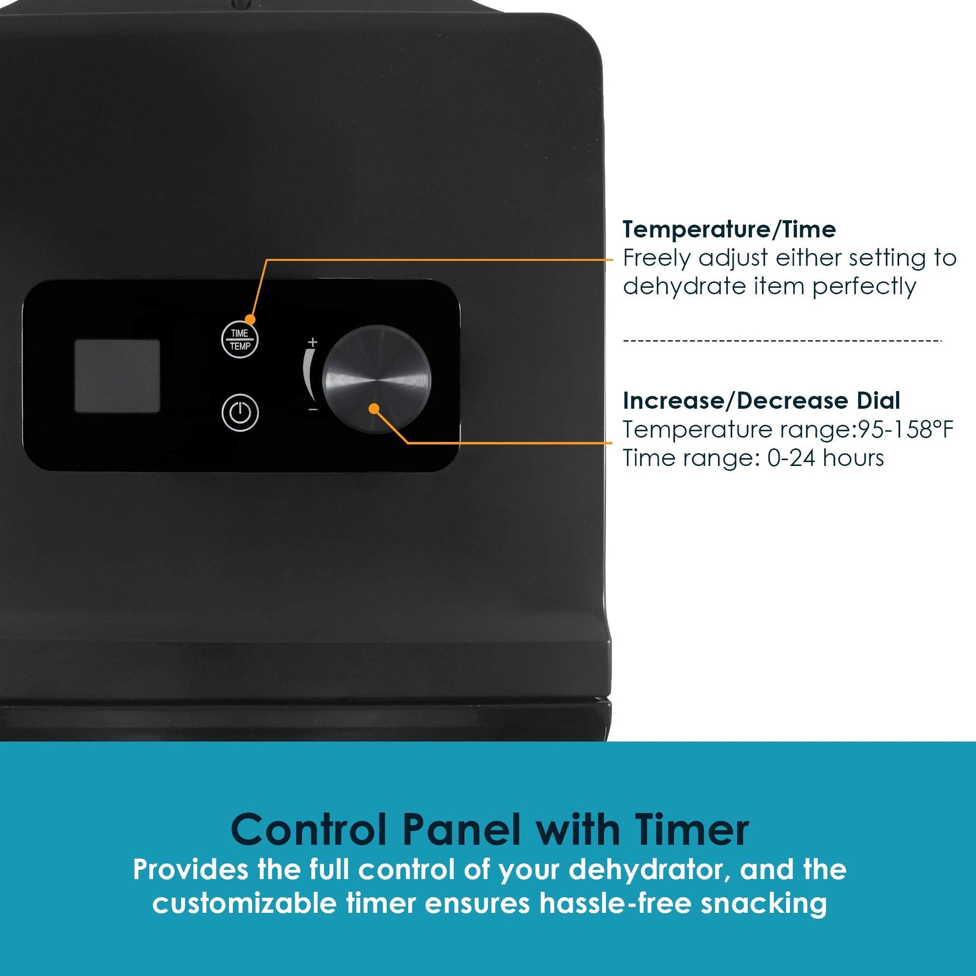 • ADJUSTABLE TIME/TEMPERATURE from 95ºF to 158ºF and up to 24 hours - foods are dehydrated at their optimal time/temperature with horizontal air flow which distributes heat evenly and efficiently.