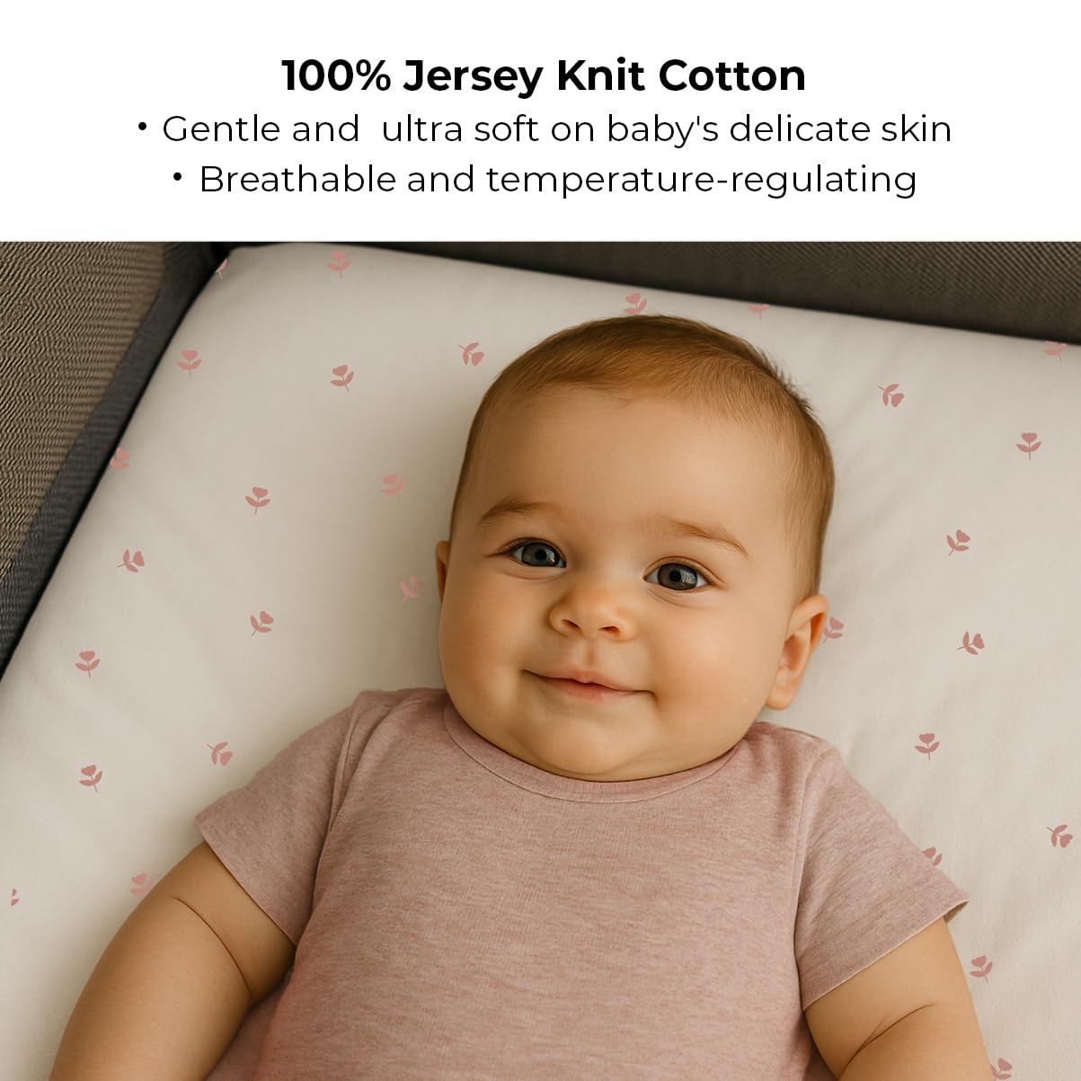 • Premium Jersey Cotton: Crafted from 100% jersey knit cotton, these fitted sheets offer a soft, breathable layer for your baby's delicate skin. The naturally stretchable, wrinkle-free fabric ensures a snug and cozy fit.