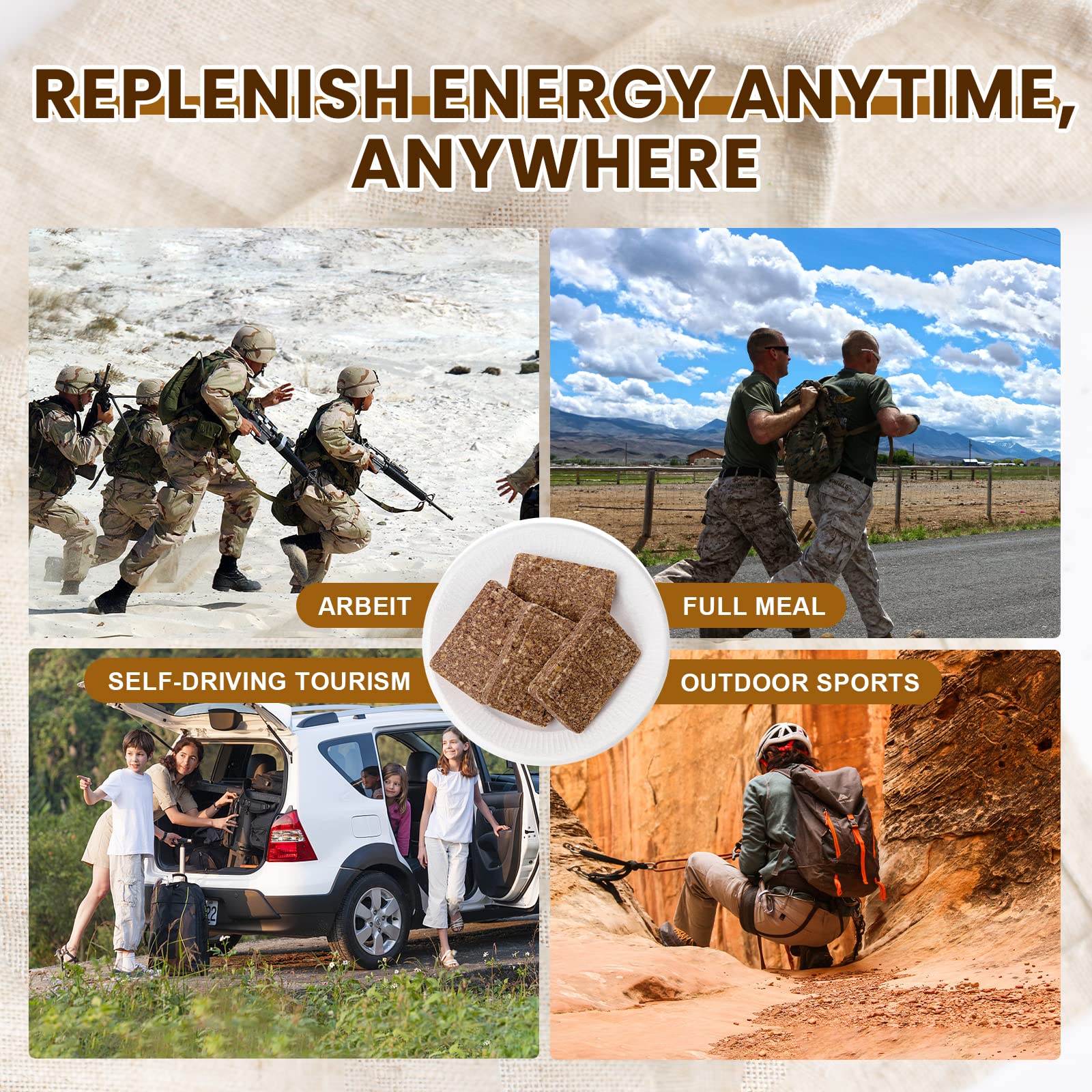 • WIDELY USED: You can eat survival ration bars when encountering emergency,such as disasters, military combat, earthquake, food, hurricane, camping, boating, or more indoor and outdoor activities during emergency, tornado, camping, boating, or more indoor and outdoor activities. This will be a good emergency reserve.