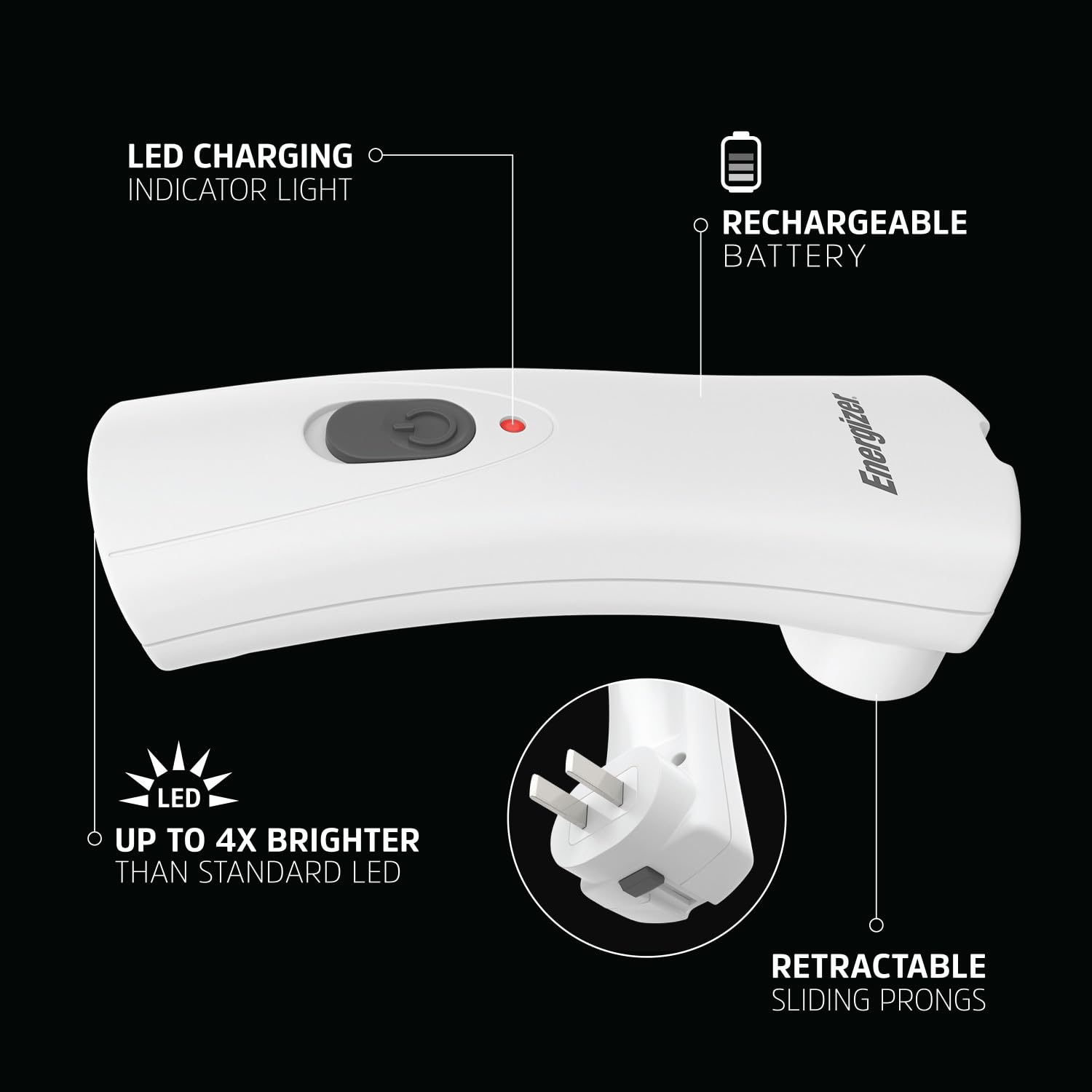 Details: Energizer Weatheready Rechargeable Compact Handheld Light helps you prepare for power outages with a rechargeable plug-in design. The LED rechargeable light features a built-in rechargeable battery and plugs into the wall so it's always charged, making it great to use as an indoor emergency light. Energizer's emergency flashlight is up to 4x brighter than standard LED technology. A retractable AC plug fits into standard outlets and folds out of the way while you use the Energizer flashlight. The pocket flashlight runs for up to 3 hours. Leave the switch in the on position while it charges so the compact flash light turns on automatically if the power goes out.