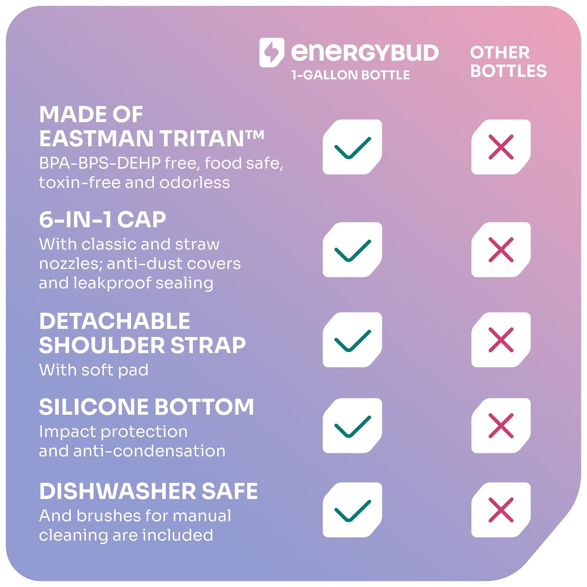 • ULTIMATE HYDRATION SAFETY. Made of Eastman Tritan material, this big water jug offers stellar hydration: 100% odorless, toxin-free, no leaching, no BPA, BPS, or DEHP. The one-gallon water bottle with straw is dishwasher-safe for effortless upkeep.