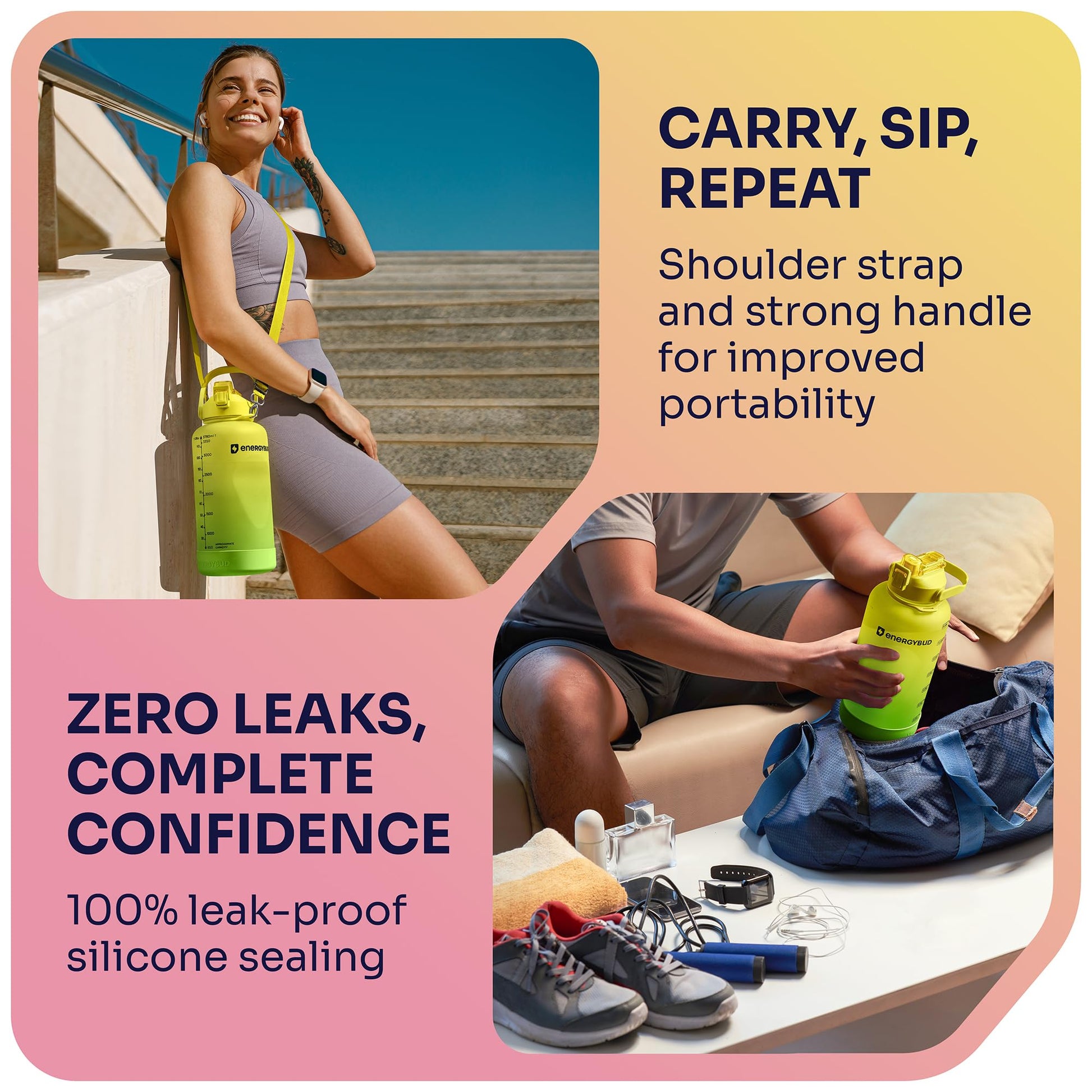 EnergyBud 1 Gallon Water Bottle Removable Straw And Handle Dishwasher-Safe BPS & BPA & DEHP Free +2 Brushes Big/Large Bottle With Time Markers Wide Mouth Leakproof 128 oz Jug (Yellow & Green)