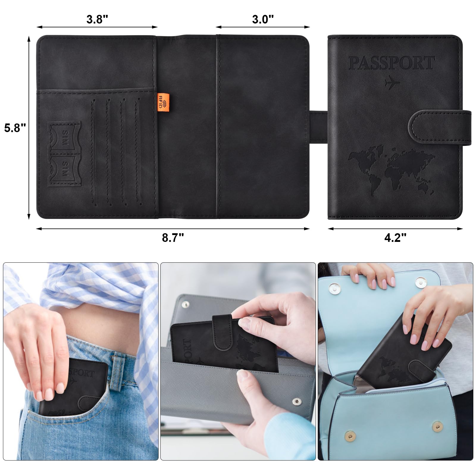 • Easy Access and Magnetic Button: Our passport wallet features a convenient magnetic button closure, making it easy to access your passport and documents quickly while keeping them secure. Say goodbye to fumbling with zippers and buttons, our passport holder is designed for ease and efficiency