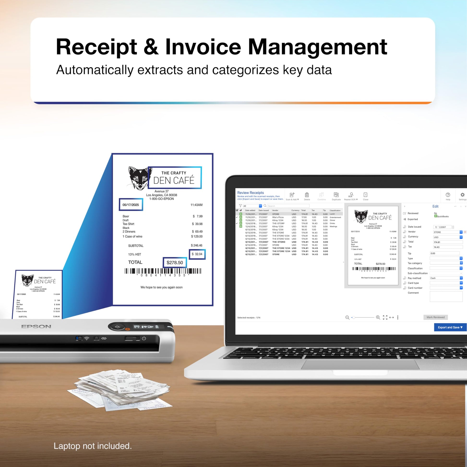 • Export to Financial Software² — Turn stacks of receipts and invoices into categorized digital data that easily integrates into financial applications, such as QuickBooks and TurboTax