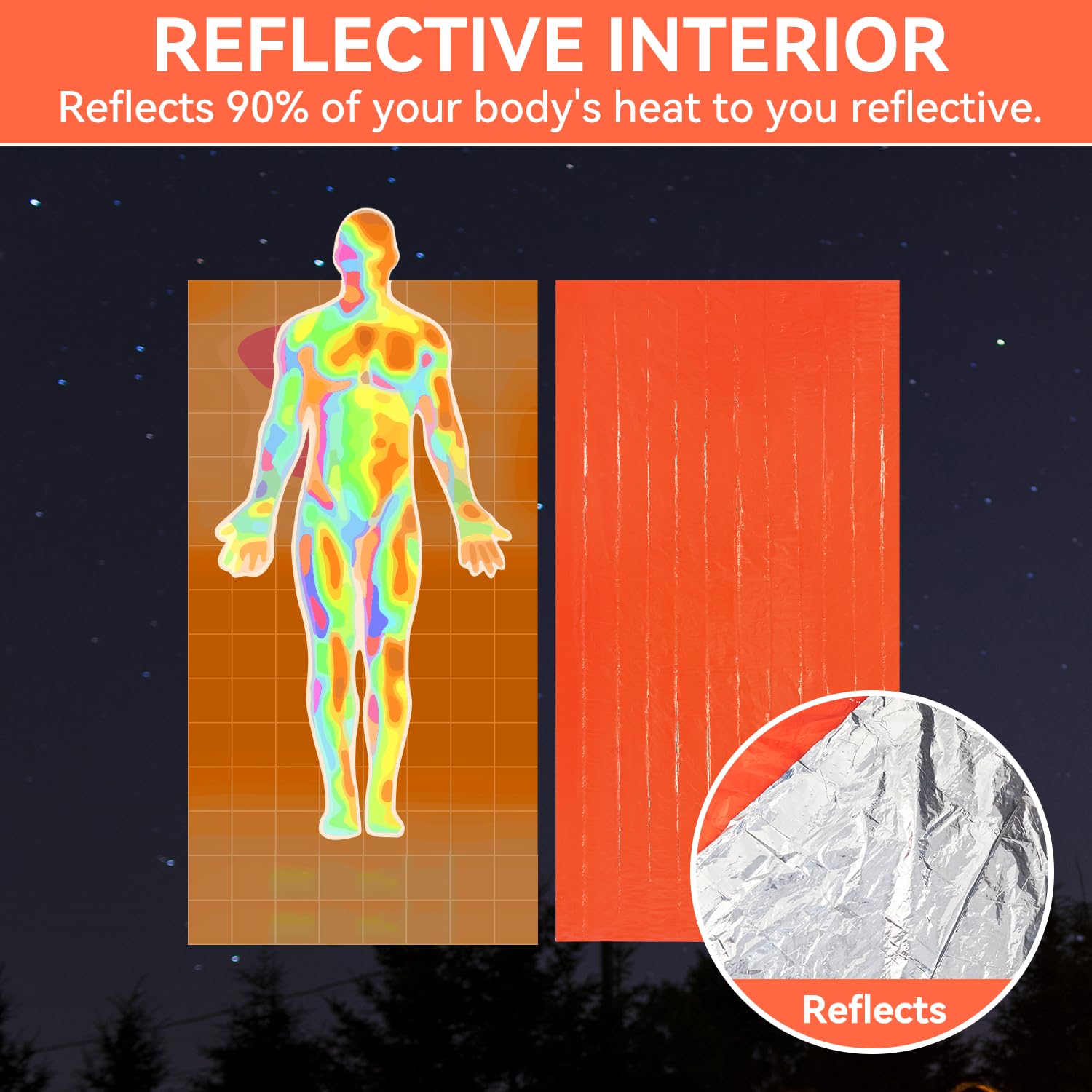 • Ultra-bright Reflective Surface: Trapped in the dark? Let this Survival Blanket Bag light the way. The bright orange emergency sleeping bag and its reflective surface will provide crucial visibility and help first res-ponders find you