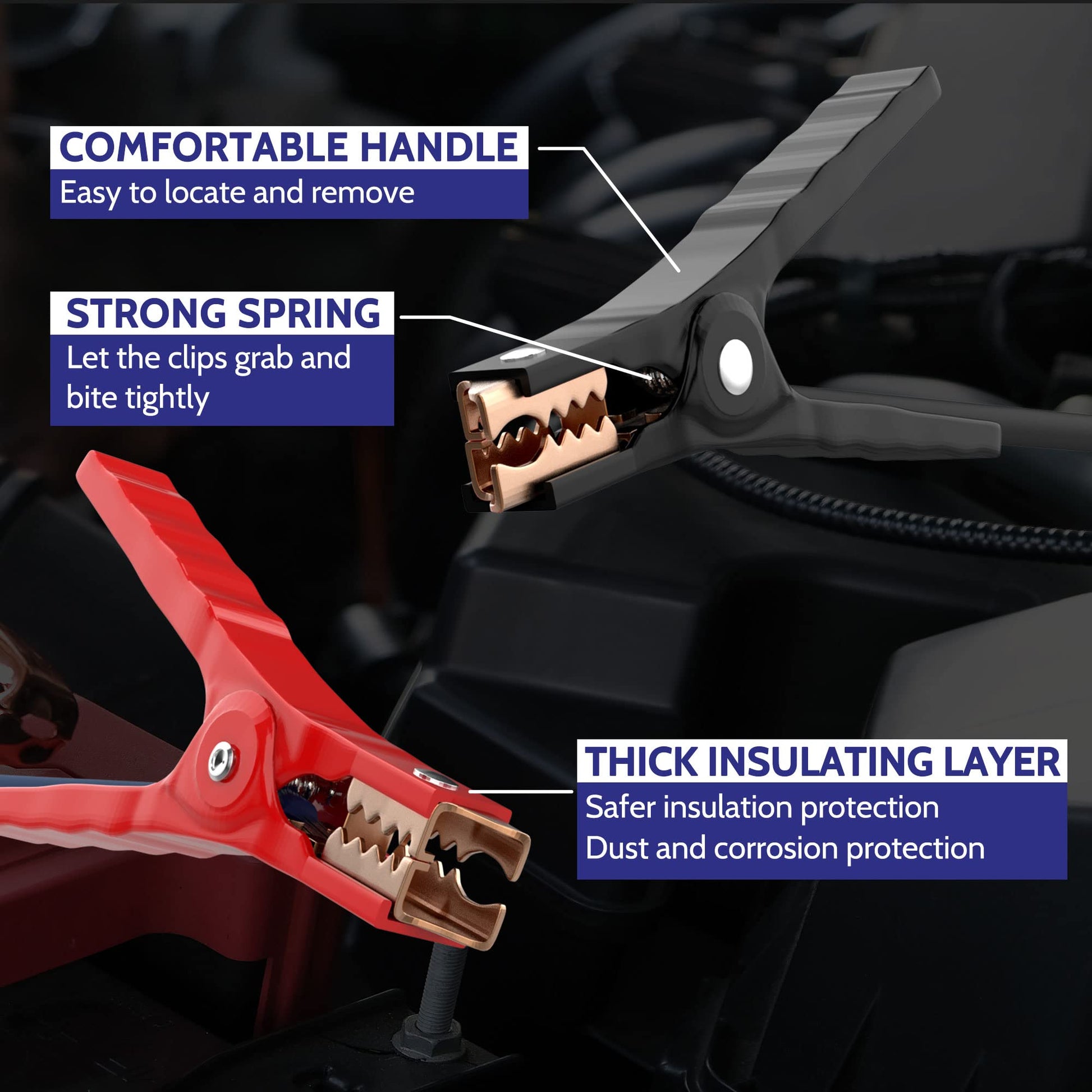 • PREMIUM FLEXIBLE CABLE - High density copper clad aluminum ensures excellent electrical conductivity. The car jumper cables remain flexible even in cold winters. The patented design of the clip with solid serrated teeth and spring is stronger than others.