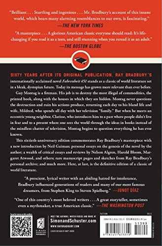 Guy Montag is a fireman. His job is to destroy the most illegal of commodities, the printed book, along with the houses in which they are hidden. Montag never questions the destruction and ruin his actions produce, returning each day to his bland life and wife, Mildred, who spends all day with her television “family.” But when he meets an eccentric young neighbor, Clarisse, who introduces him to a past where people didn’t live in fear and to a present where one sees the world through the ideas in books instead of the mindless chatter of television, Montag begins to question everything he has ever known.