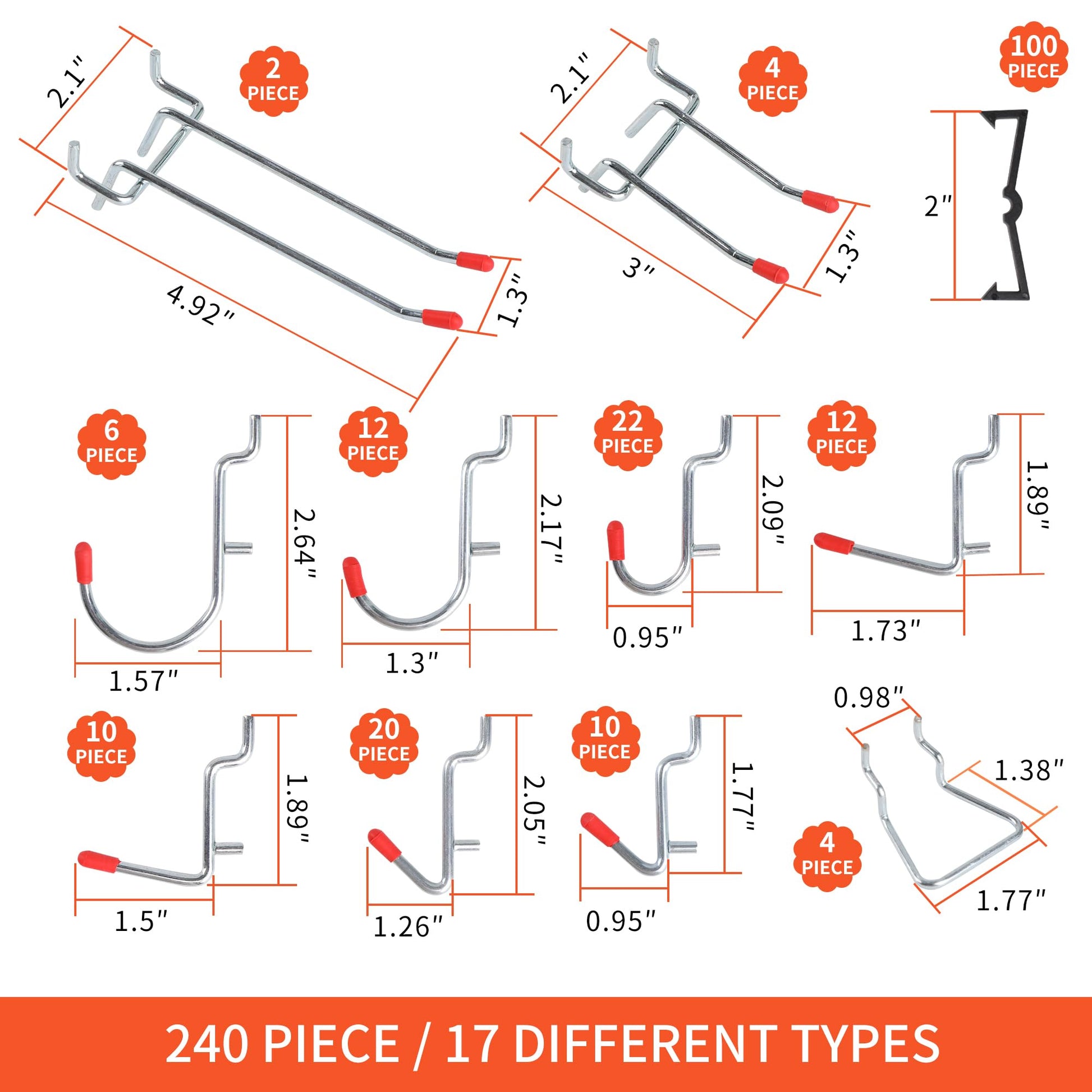 • Super Value Package:Our pegboard wall organizer includes 240 pieces of pegboard accessories,17 different types of peg board hooks like pegboard bins, pegboard cups, straight hooks, angled hooks, curved hooks, tool holders, pliers holders, peg locks, and more. Providing versatile storage solutions for a wide range of tools.