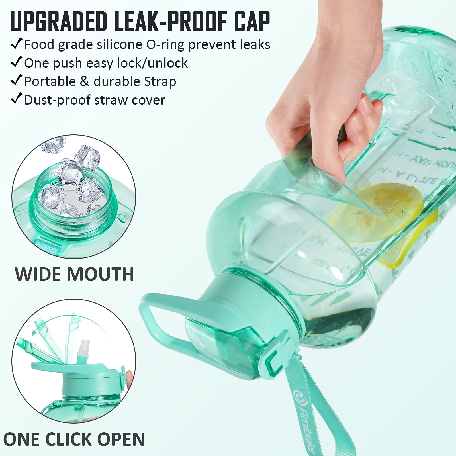 • HUMANIZED DESIGNS: Our 64 oz water bottle with straw is designed with a upgraded lid that ensures 100% leak proof and dust proof. Advanced one-click button makes you drink easier, just pushing the button and the straw will pops out automatically. You can enjoy spill-proof sipping with straw or fast water flow without lid. With a wide mouth, this big water bottle not only is easy to fit ice cubes and fruits, but very easy to clean, just need to simply wash it with Baking Soda and Vinegar