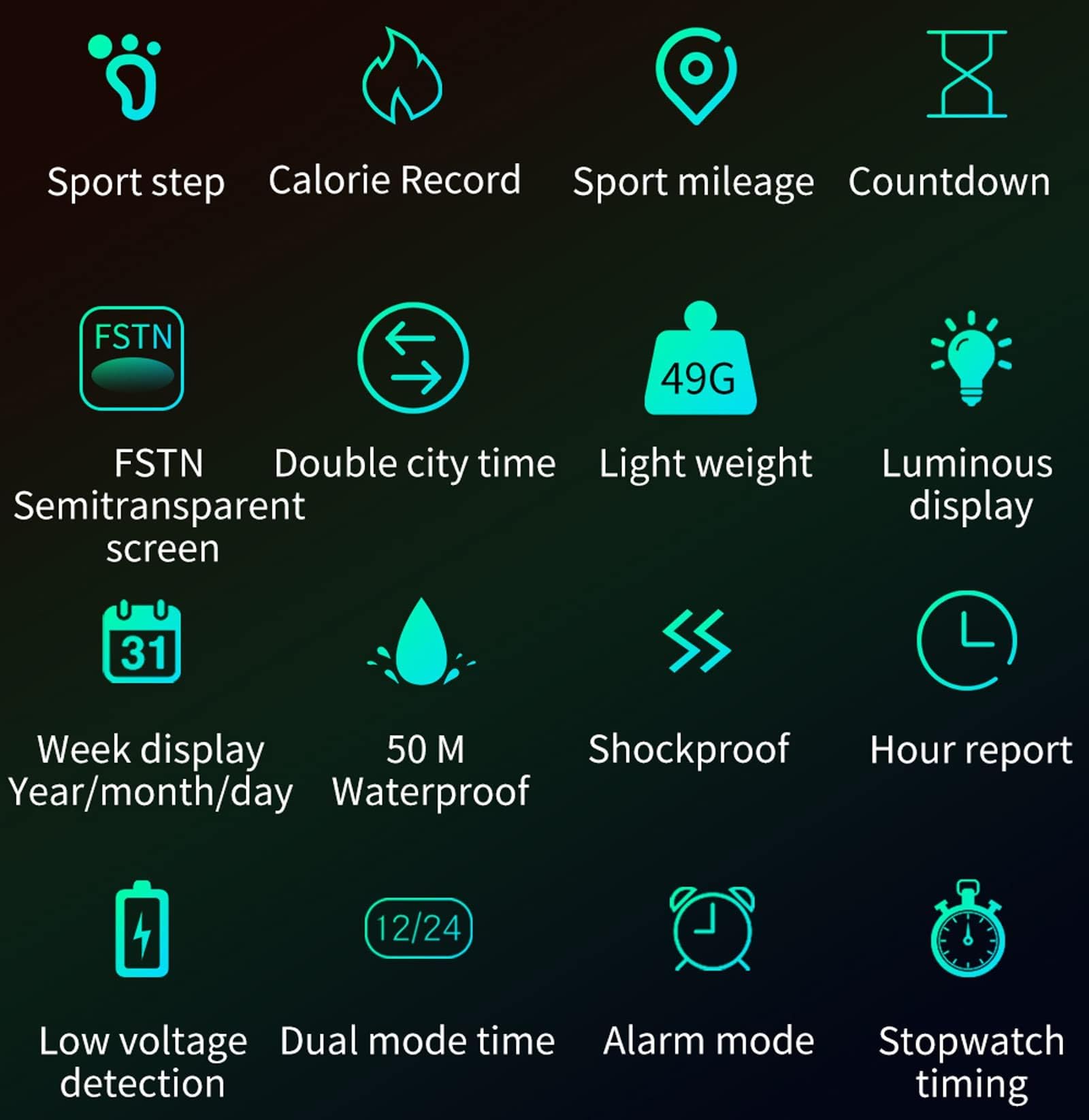 • Pedometer Watch: This well-designed step counter watch is ideal for sport fans, with real-time tracking your every step, calories burned, distance walked and exercise time. Through these comprehensive activity data, help you better understand your sports performance.