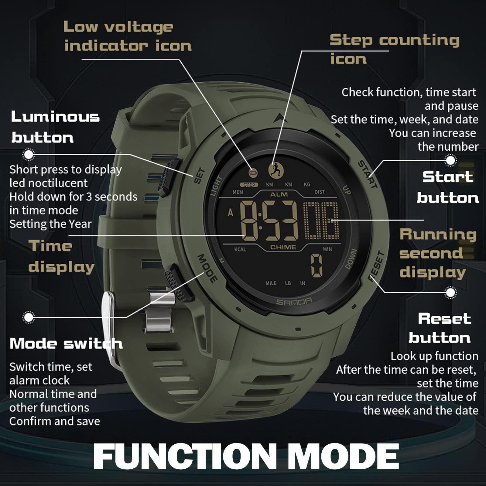 • Digital Watch: The digital military watches equip with ABS case, TPU watch band and plexiglass FSTN mirror. The case diameter is 44mm/ 1.73in, case thickness: 15mm/ 0.59in. Enough strong for most outdoor activities. And the cool appearance, reflecting a masculine and adventurous style.