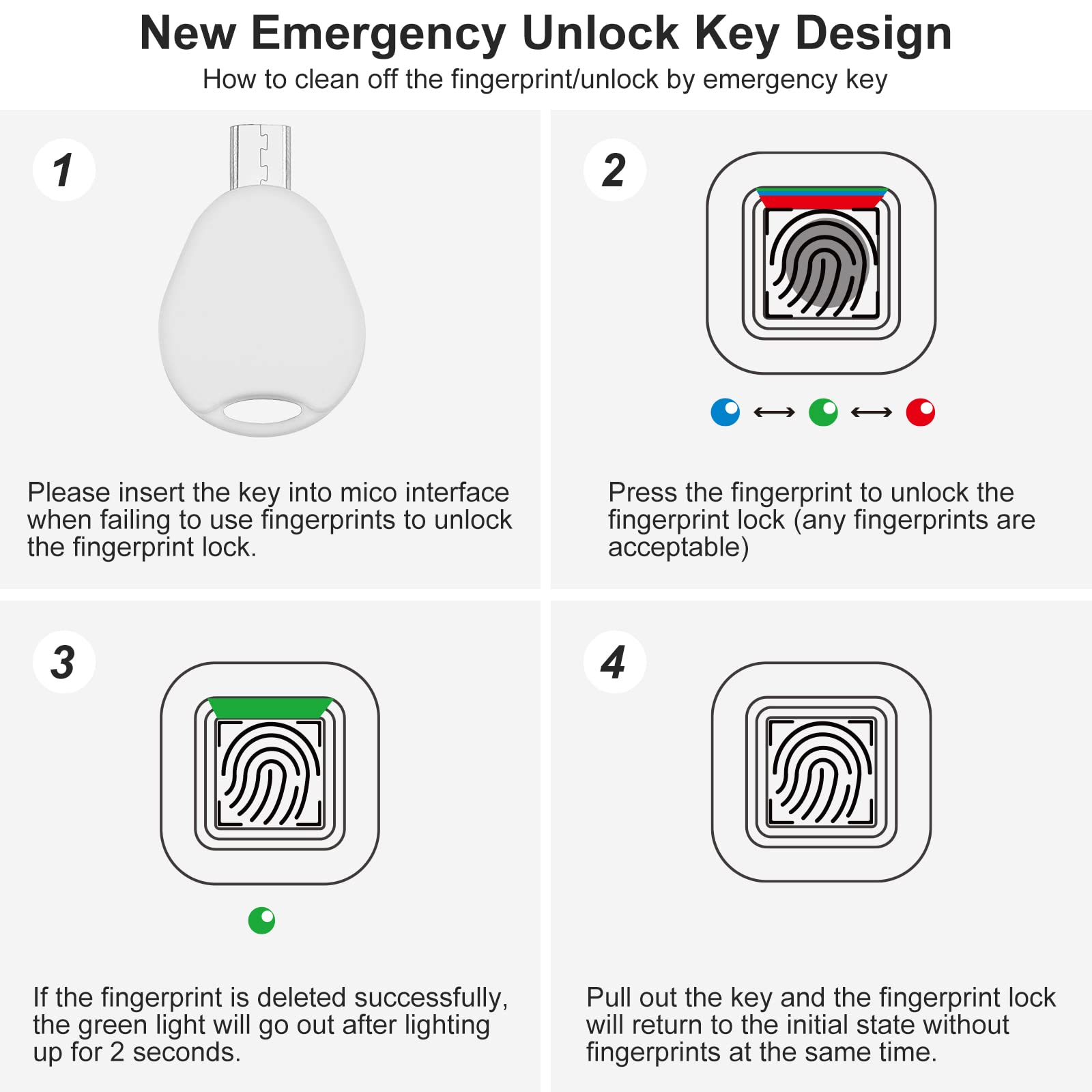 • 【360° Fingerprint Recognition】-- Friendly to kids and elderly, no need for an app, key, or Bluetooth. Just follow the direction in the guidebook to enter or delete the fingerprint, Move the finger at multiple angles when entering the fingerprints, to better recognize the fingerprint when unlocking