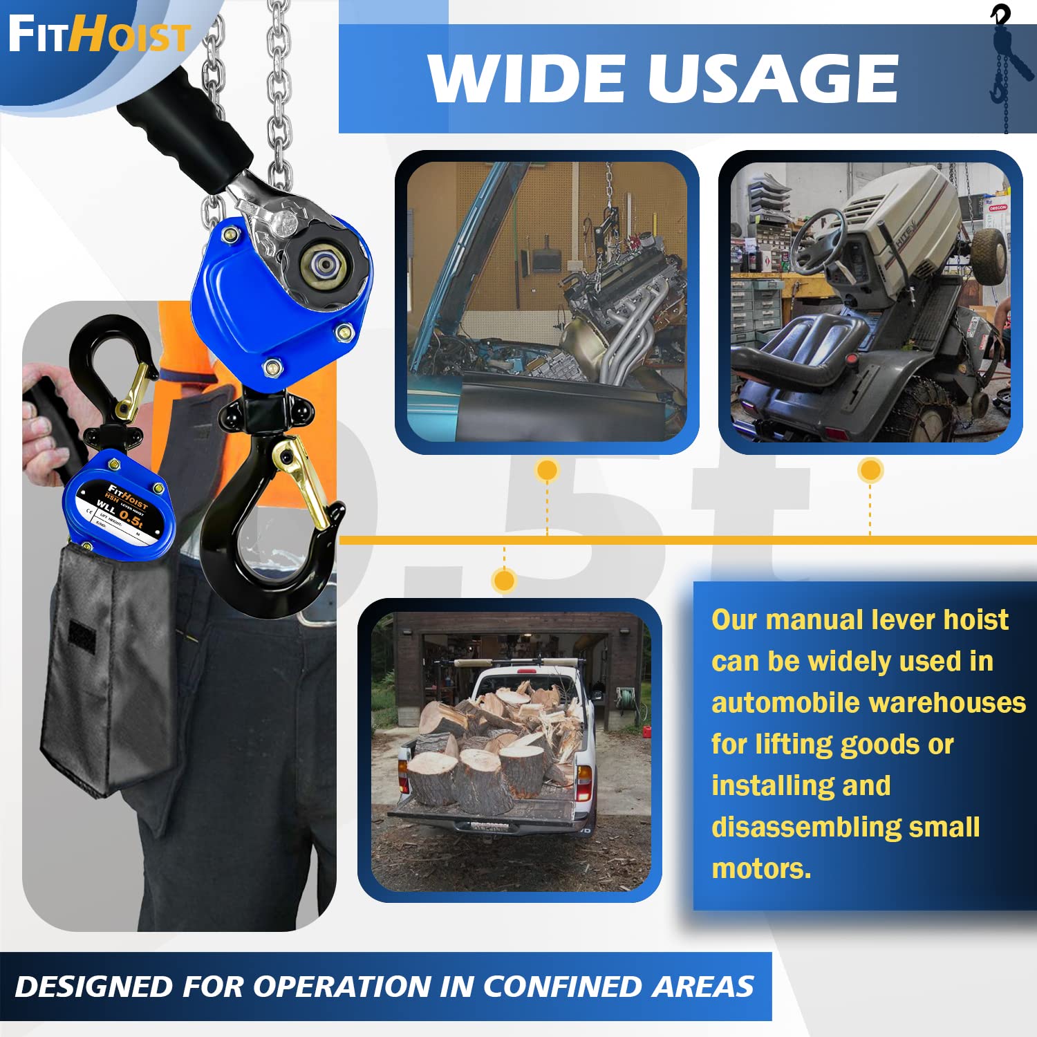 FITHOIST Mini Chain Hoist 1/2 Ton 1100Lbs Capacity 10Ft Lift Manual Lever Chain Hoist Alloy Steel G80 Chain 2 Heavy Duty Hooks, for Garages Warehouse Automotive Machinery