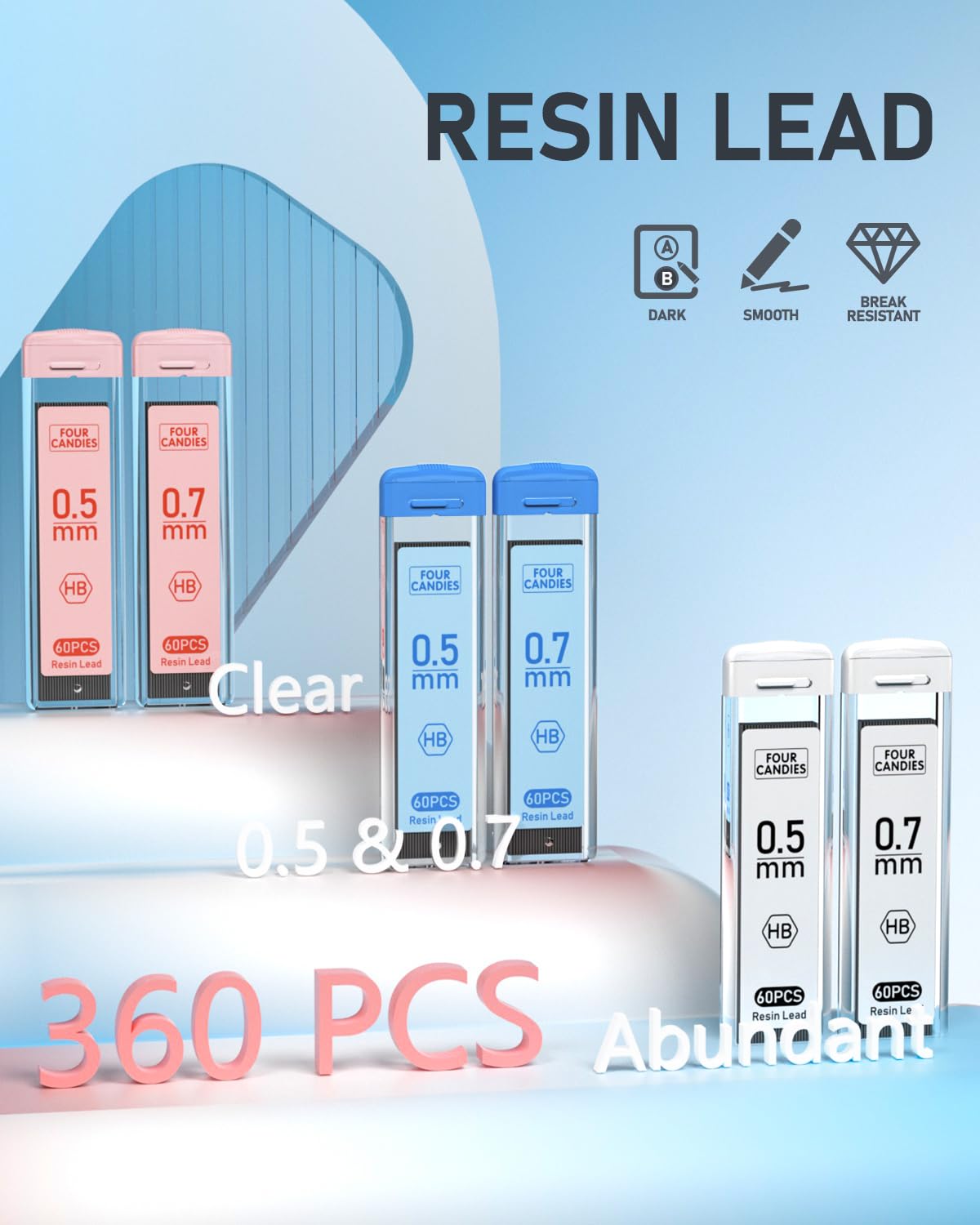 Four Candies Mechanical Pencil Set with Case, 6PCS Aesthetic Mechanical Pencils 0.5 & 0.7mm with 360PCS HB Lead Refills, 3PCS Erasers, 9PCS Eraser Refills for writing, drawing and sketching