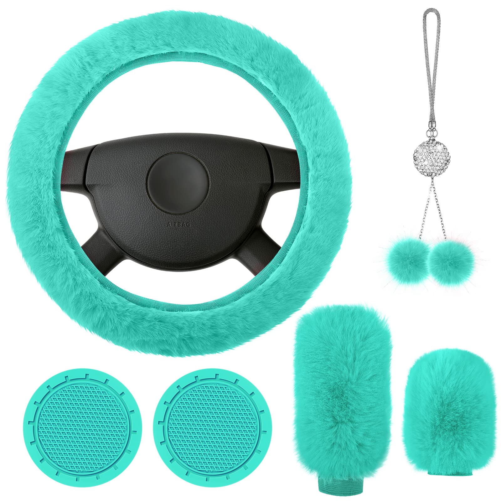 Frienda 6 Pieces Fluffy Car Accessories Set Bling Fluffy Steering Wheel Cover Soft Fuzz Handbrake Gear Shift Cover Bling Mirror Fuzz Car Pad Decoration(Mint Green)