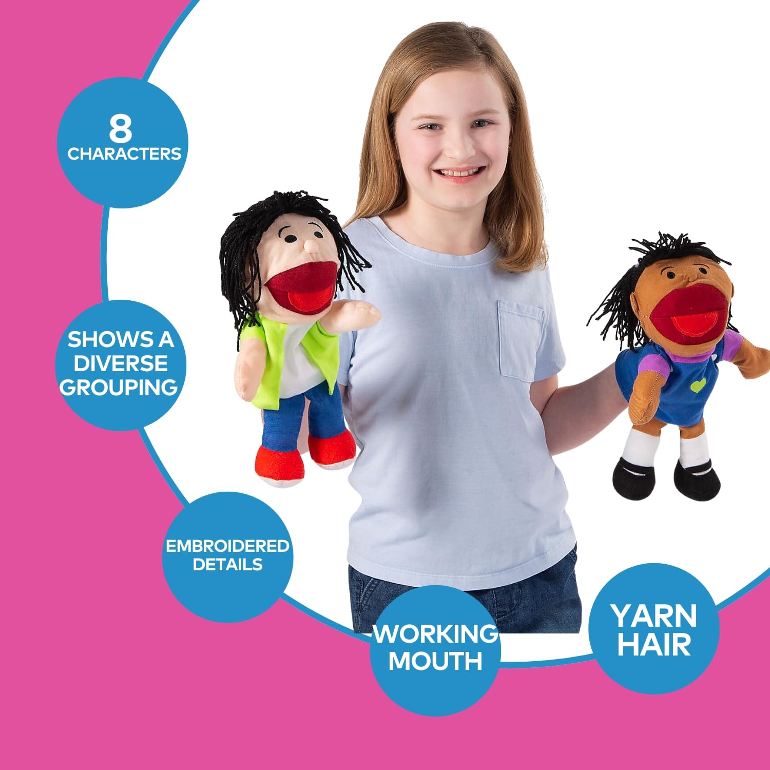 Fun Express 14" Happy Kids Stuffed Hand Puppets with Movable Mouths - 8 Puppets - Multicultural - Great for School and Home