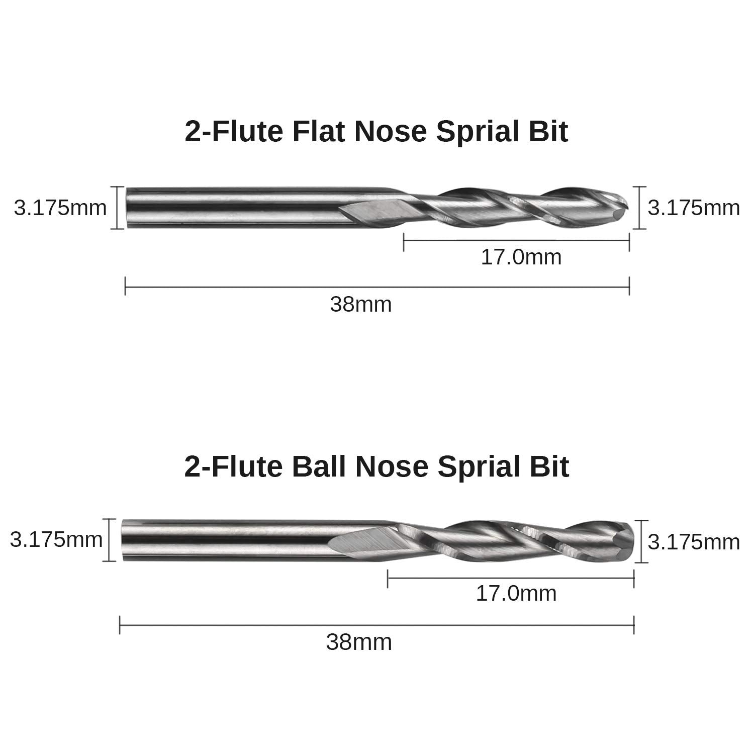 • 2-Flute Spiral Flat Nose & Ball Nose End Mills -- Shank Diameter: 3.175mm, Cutting Diameter: 3.175mm, Cutting Length: 17mm, Overall Length: 38mm.