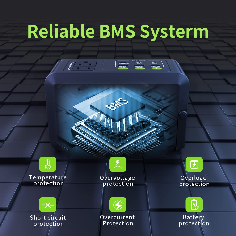 • Multi Output : This camping power bank with AC Outlets equipped with 88Wh (24000mAh, 3.7V) capacity, 2*QC 3.0 USB ports , 1*USB ports (5V 2.4A), 1*USB C port(18W). 2*DC port(12V/10A), 1*2 pole and 1* 3 pole output socket (120W running, 150W peak). Powers cell phone, iPad, tablet, camera, radio, USB powered night light, mini fan under 150W. You can use the light (5W) for about 15 hours or more, use the smartphone for about 5 times or more, and use the PSP for more than 10 hours.