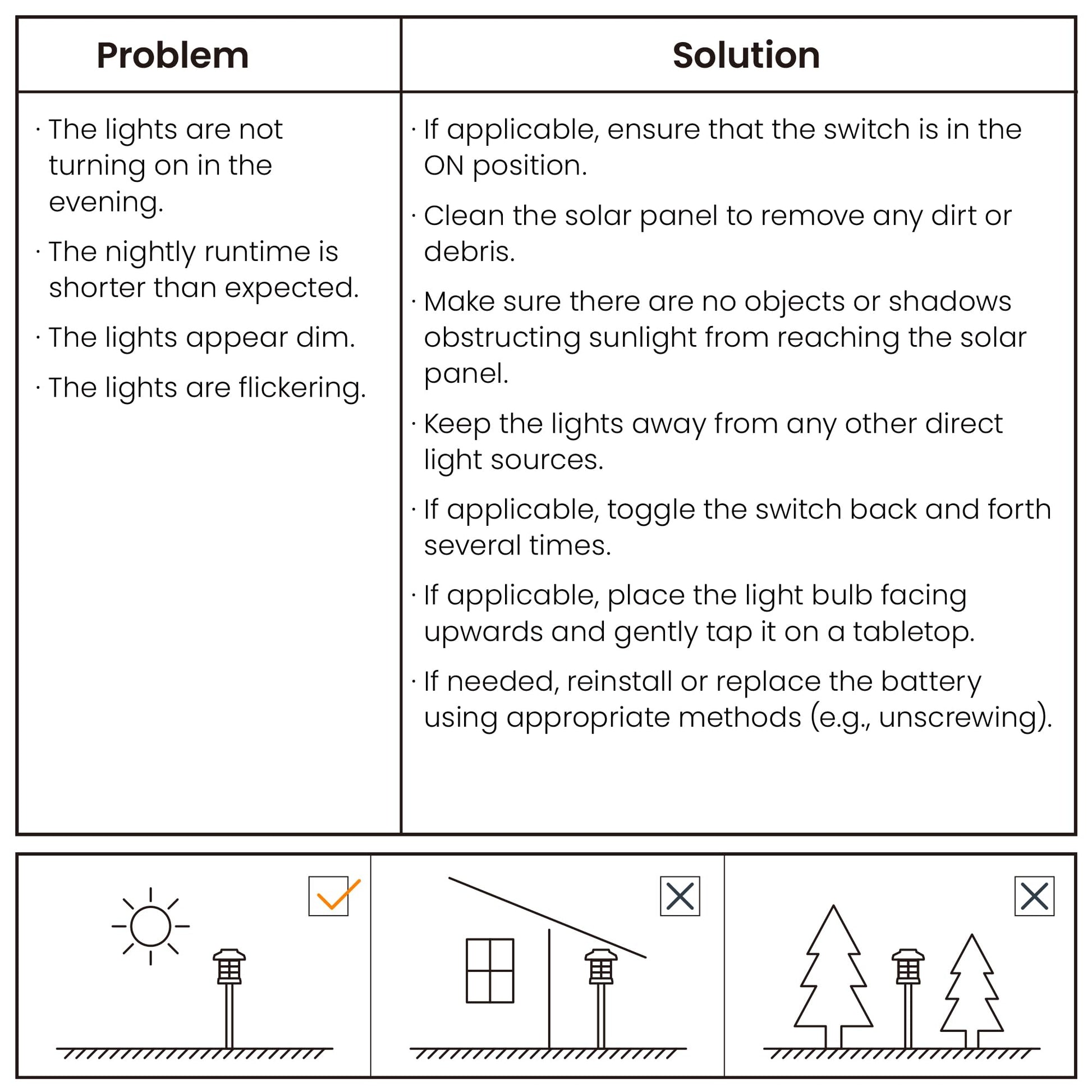 • QUICK START GUIDE : Ensure the switch is ON, charge in direct sunlight for 4+ hours (new arrivals may need recharging after shipping), and install in a place in direct sunlight (6+ hrs/day, no shade) and away from night light