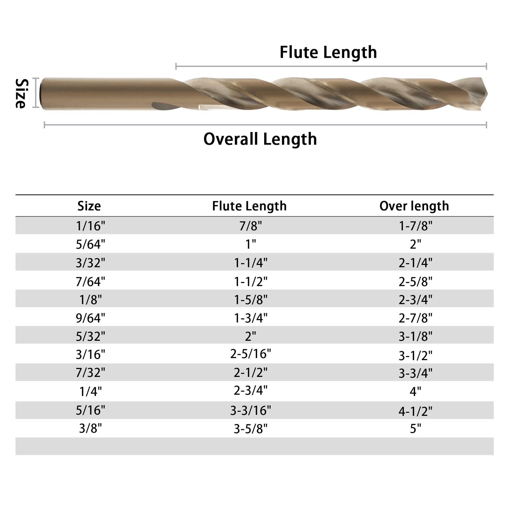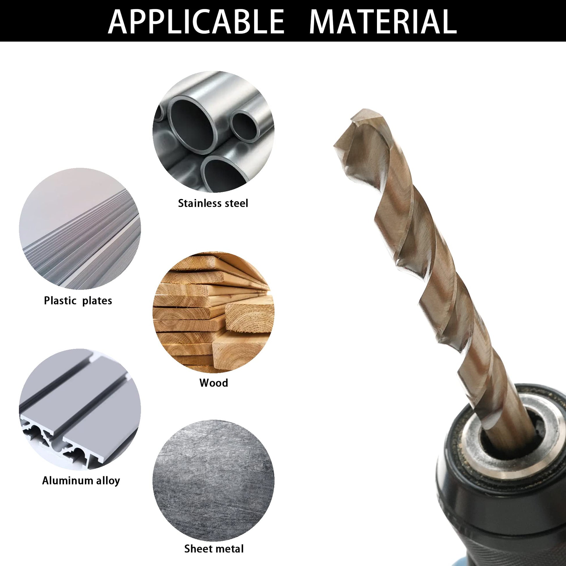 • Professional Drill Bits: gold oxide finish and round straight shanks, fully ground spiral groove design with high grinding accuracy, for cutting stainless steel, steel and cast iron as well as wood, aluminum alloys and other metals.