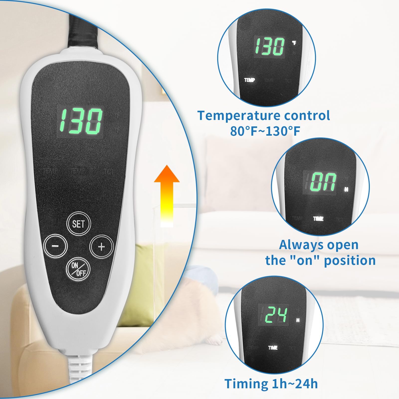 • Intelligent Thermostat: Adjustable temperature 80°F~130°F, the opening time between 1 hour~24 hours is freely adjustable, new normally open function 'on' gear. Please note that turn off the pet heating pad promptly after use