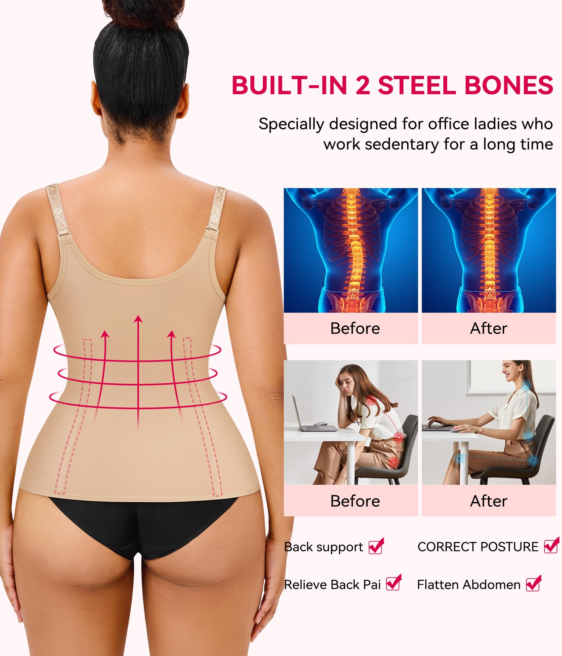 • U-type Anti-droop Breast design which keeping push up breast,Effectively firm concrol armpit & back flabby fat.High quality zipper easy to pull from the bottom and allows you to hide it and gives you a slimmer and cleaner look.