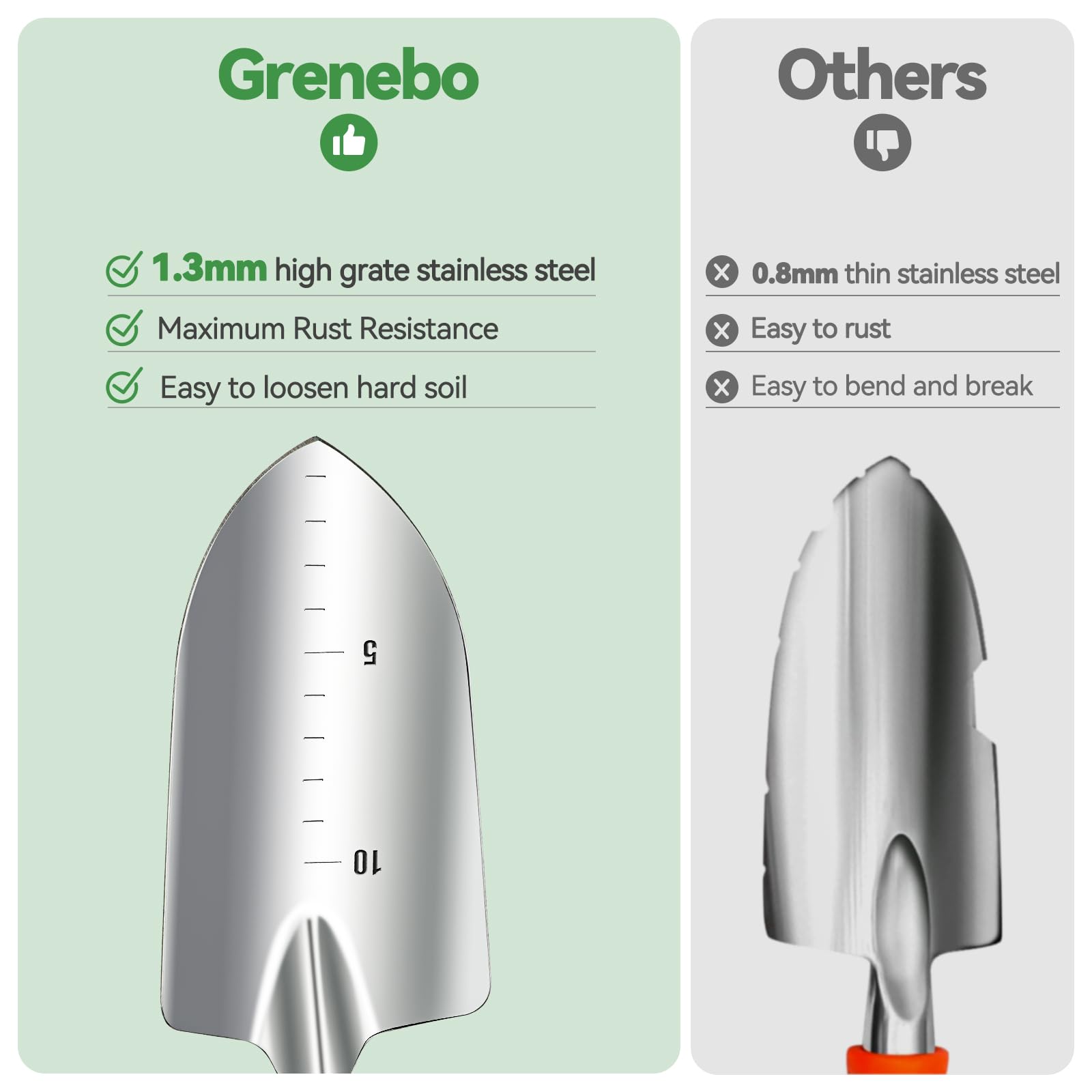 • One for All Package: Grenebo garden tools set includes a total of 8 tools and 1 storage bag. Pruning Shears, Weedier, Transplanter, Cultivator, etc., nearly everything you need in daily garden maintenance
