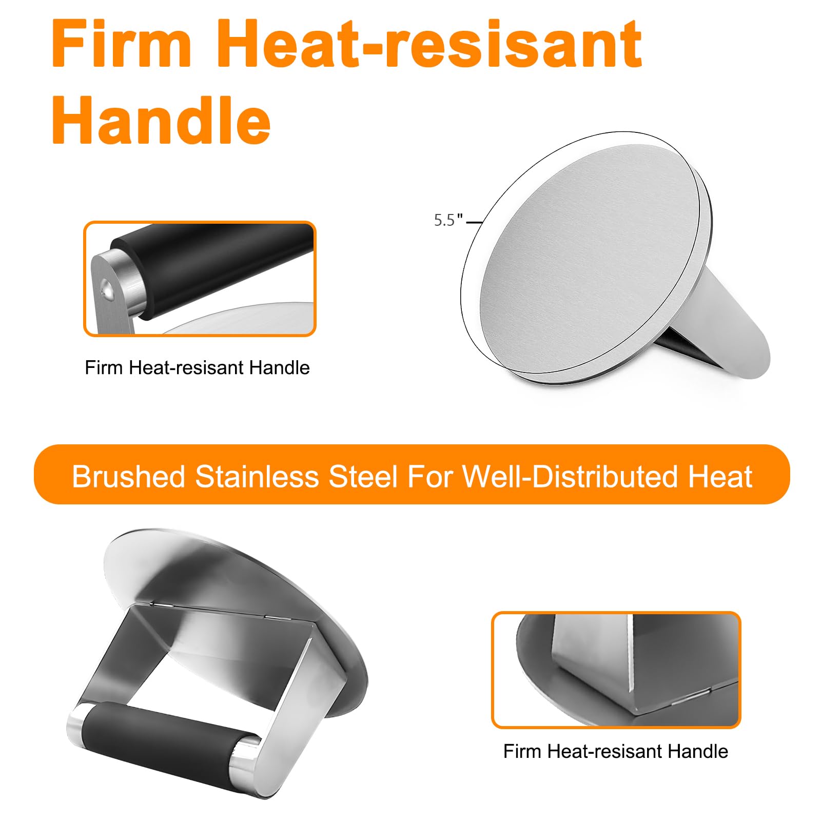 • Comprehensive Griddle Set: Perfect for indoor and outdoor grilling, this versatile set works with all flat top griddles, including skillets. The long-handled spatula flips large quantities quickly, while the cover speeds up cooking and prevents splashes. The meat press ensures even heating