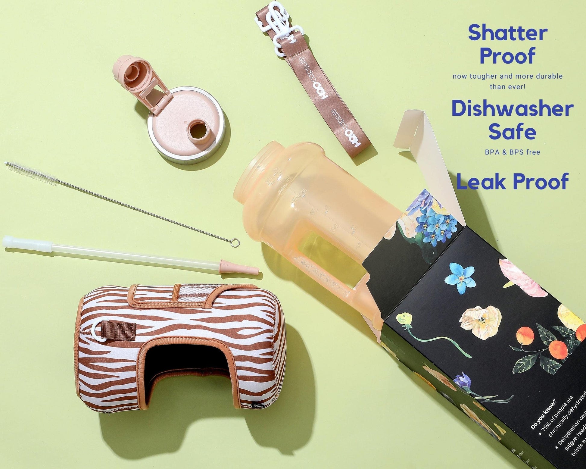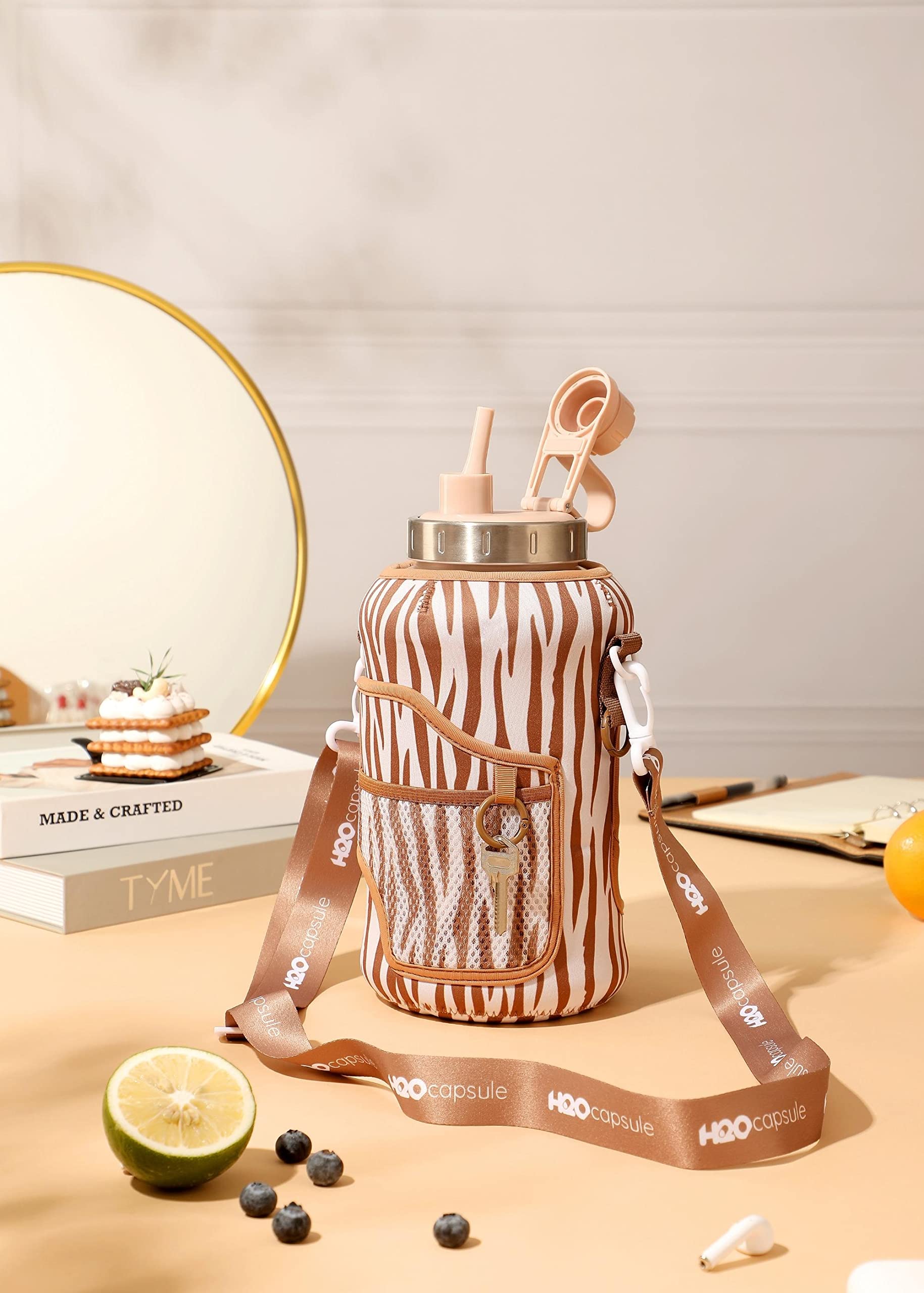 H2O Capsule 2.2L Half Gallon Wide Mouth Water Bottle with Storage Sleeve and Removable Straw - Hydration Tracker Jug with Measurements Marked – Shatterproof BPA-Free, (Libra Zebra)