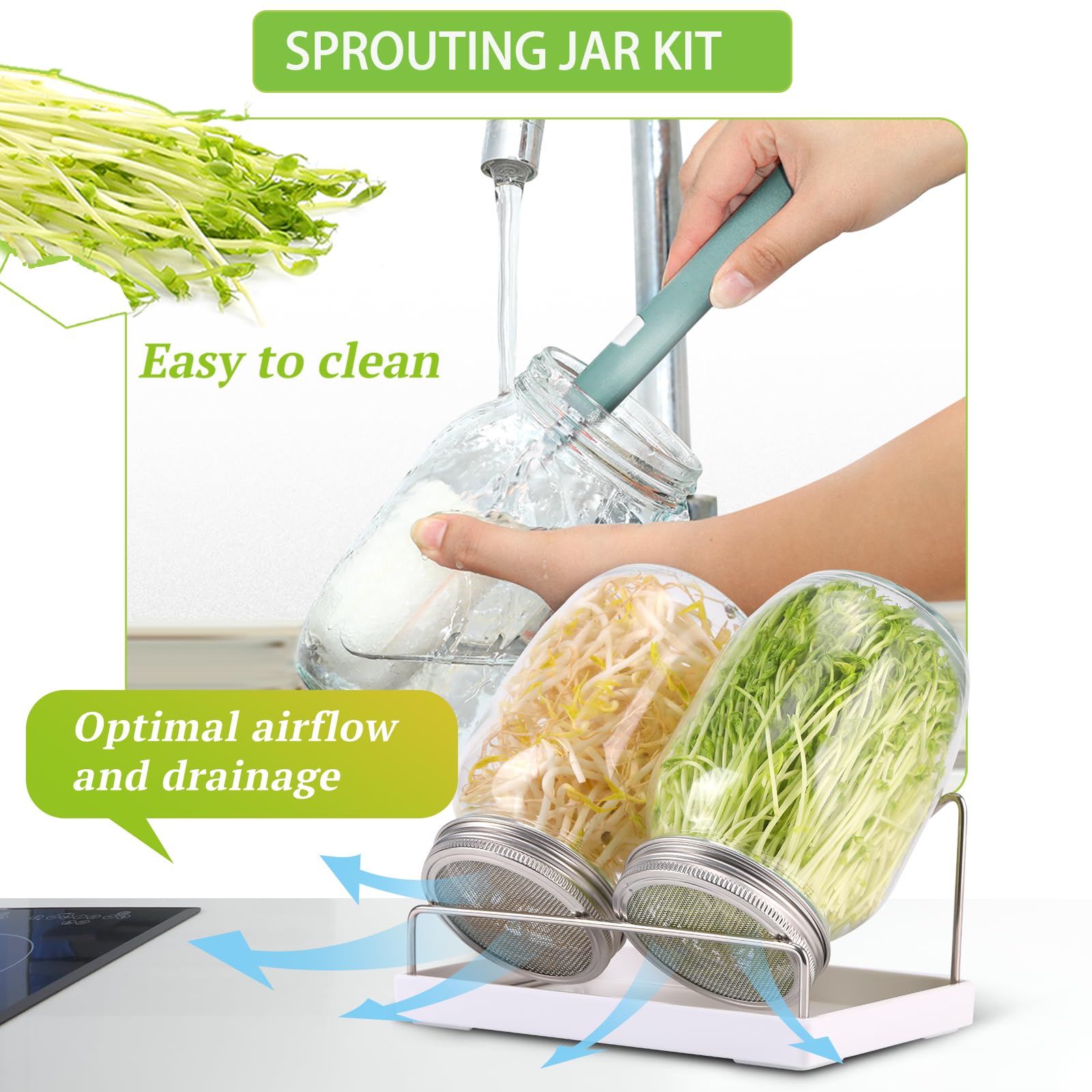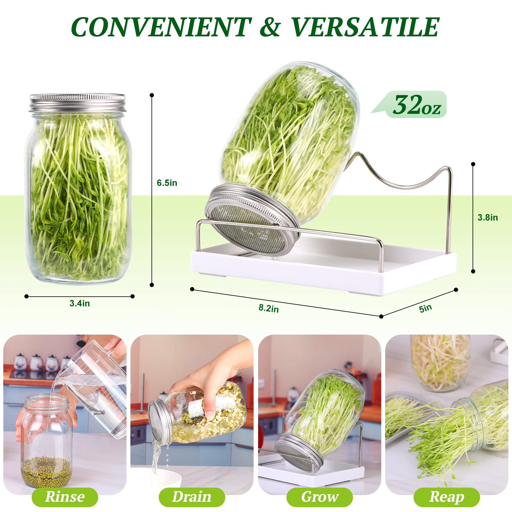 • 【SPROUTING JAR KIT-YOU GET】2Pcs 32oz mason jars,2Pcs Screen Sprout Lids,2Pcs Blackout Sleeves,1Pcs Sprouter Stand,1Pcs Tray.This sprouting jar kit includes all the parts you need to grow most sprouts at home! Harvest your own fresher sprouts without having to perform too many complicated operations.