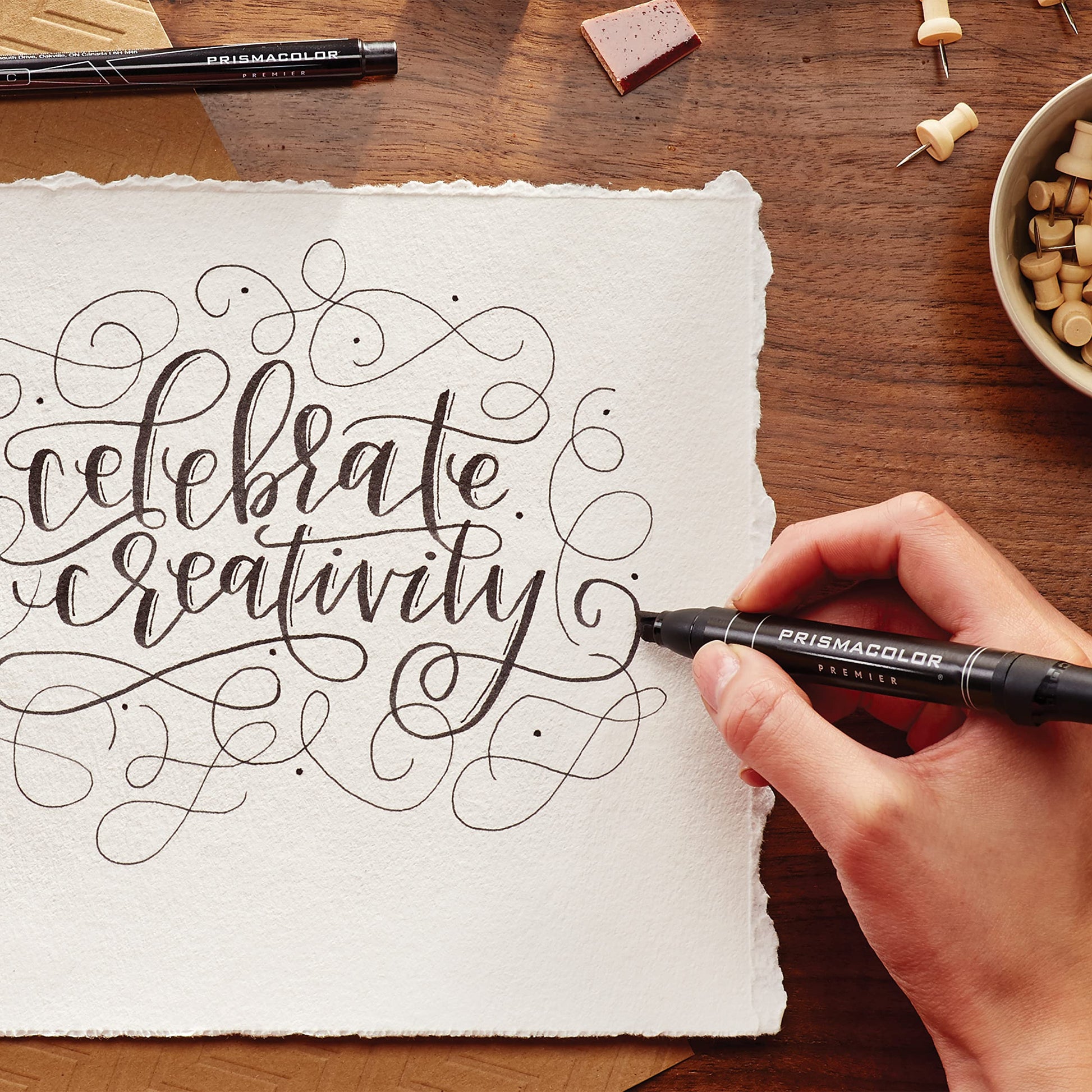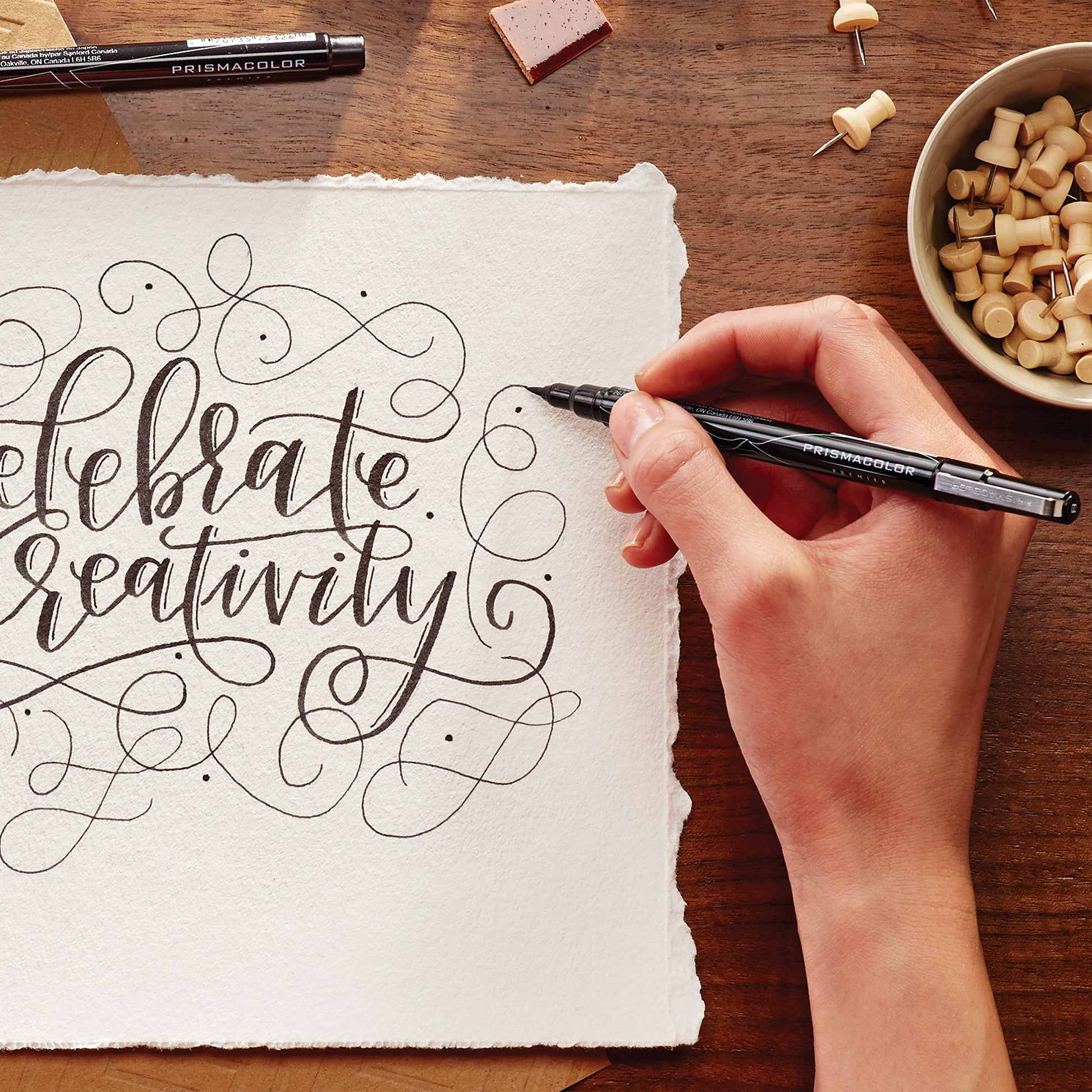 • Everything you need to try hand lettering: 2 pencils, 3 illustration markers, a dual-ended art marker, an eraser and a tips/tricks pamphlet