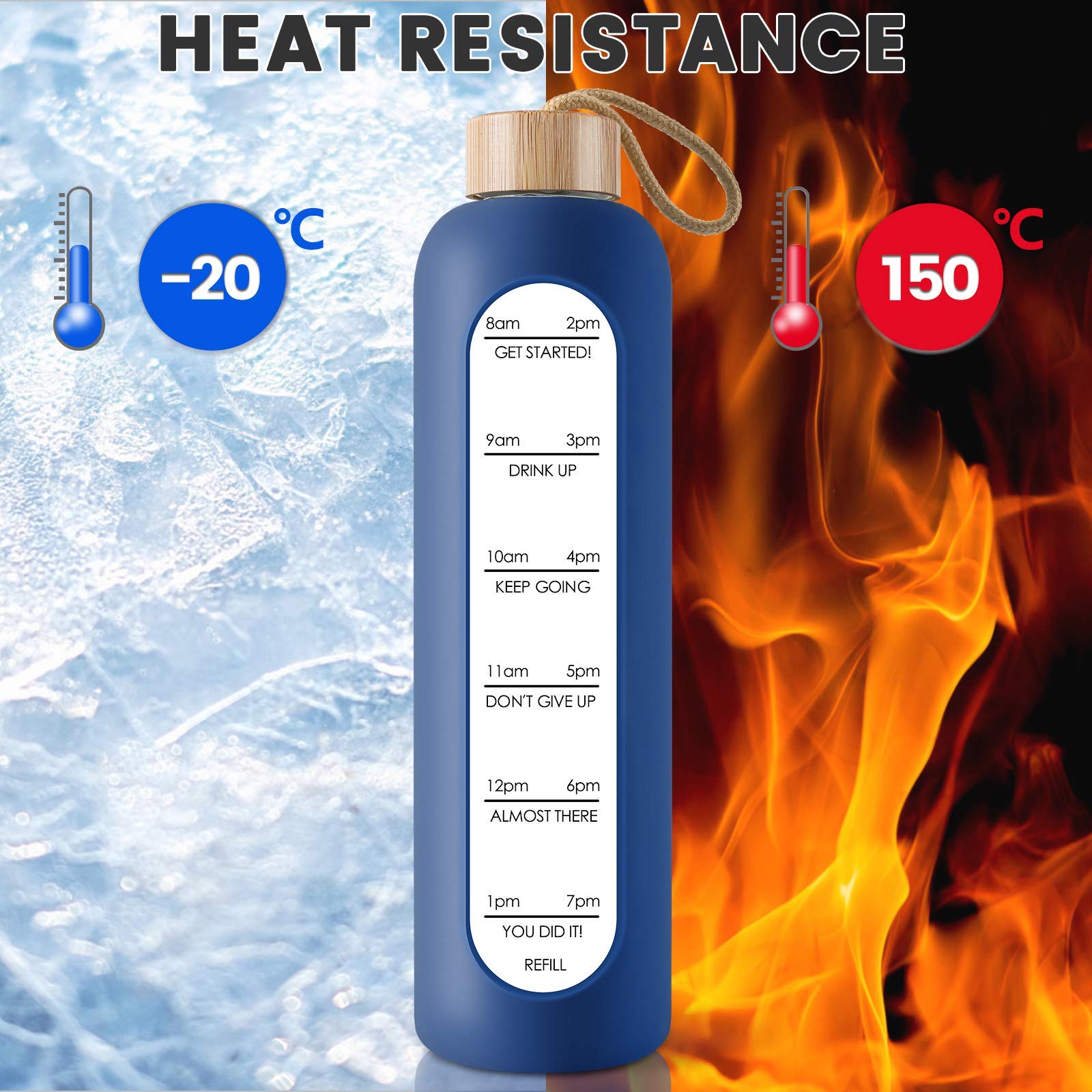 • Durable and Leak Proof :Our leak proof and reusable cute water bottle glass with hourly markings is made of borosilicate glass which is BPA, BPS, PVC, Lead, and Cadmium free; This durable glass drinking bottle will not crack under extreme temperature and pressure