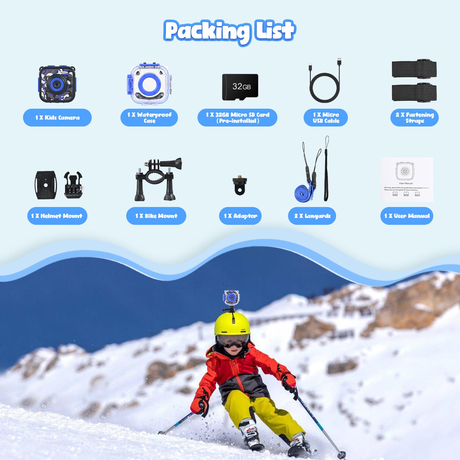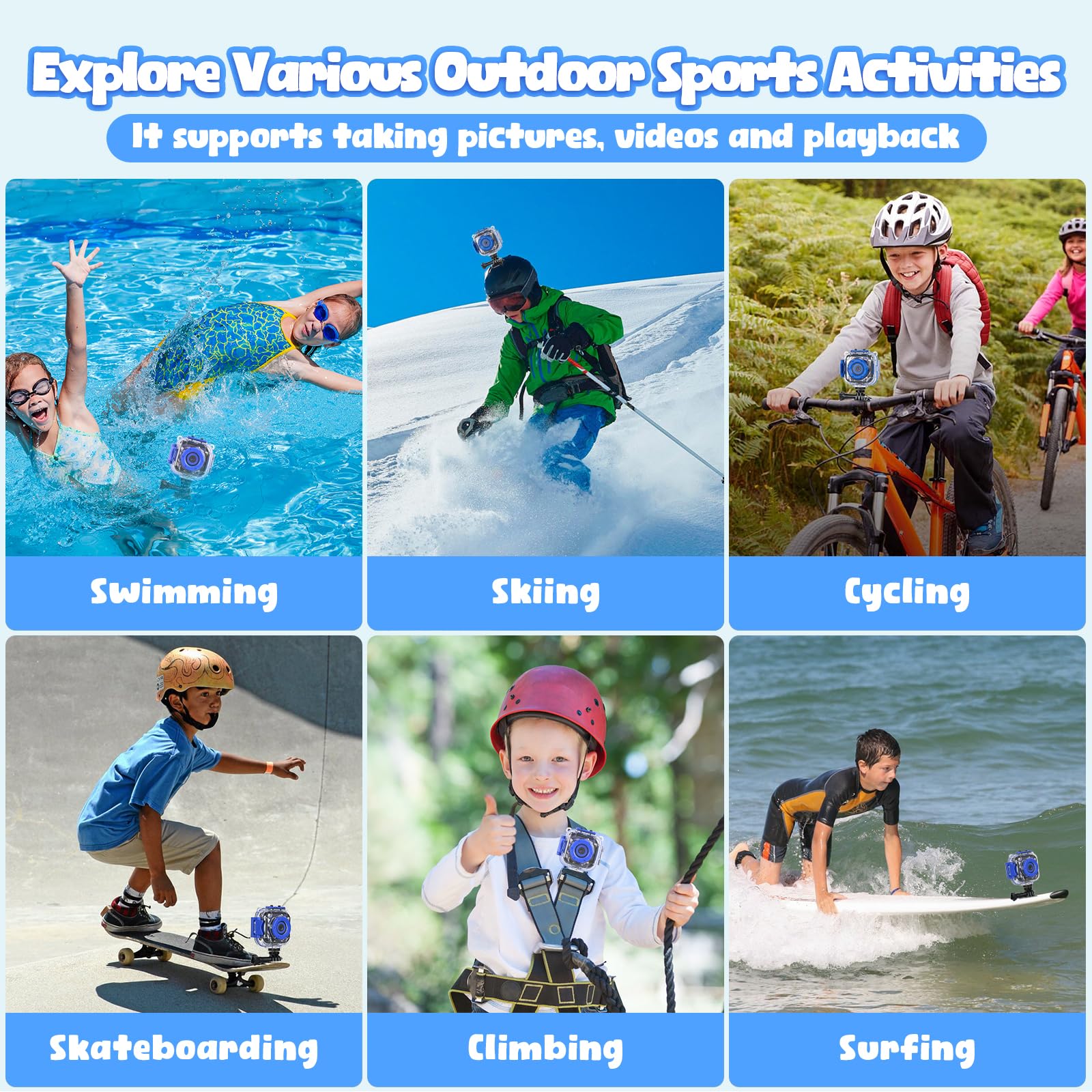 • Kids Waterproof Camera Depth UP To 98ft - Really kids underwater camera comes with strong case and accessories for skating swimming bike skateboard helmet. Cool kids camera can take pictures and videos. Great action camera for kids sports toy!