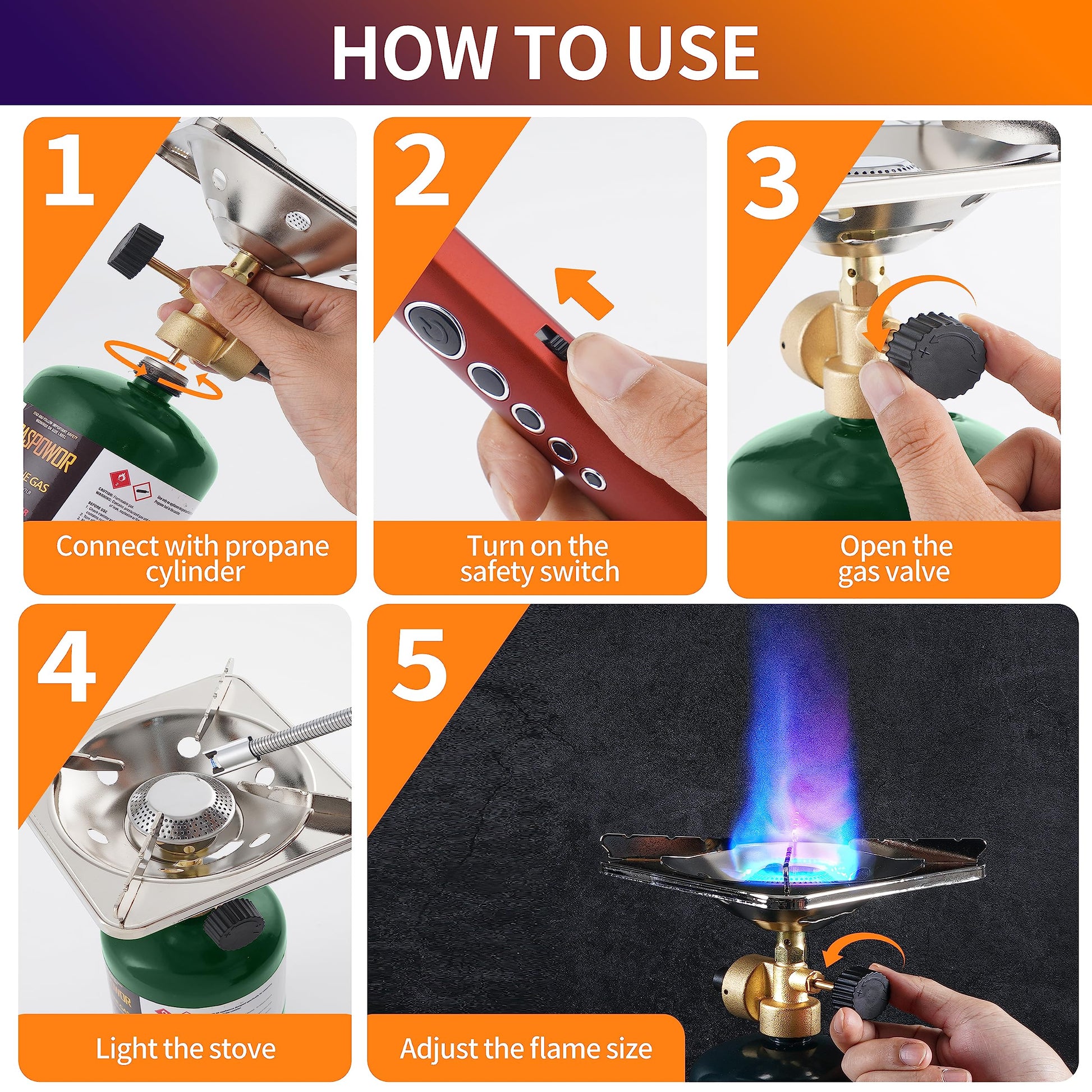 • 🔥【CSA Certified Camping Stove Propane 】GASPOWOR Camping Stove Propane is CSA certified and crafted with high-quality materials, ensuring its durability and safety during use. Additionally, we provide 1-year quality support. If you encounter any post-purchase issues, our professional support team is available to assist you at any time.