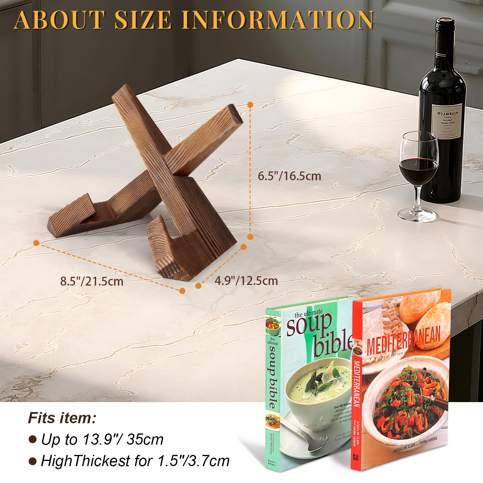 • STURDY AND DURABLE: The cookbook holder is made of natural and high-quality solid wood, which is lighter and sturdier than bamboo. The wood is carbonized to show a beautiful and clear wood grain; all edges are smooth and comfortable through finely sanded. The cross-type assembly design is flexible, compact and stable in structure that doesn't take up too much kitchen counter space.