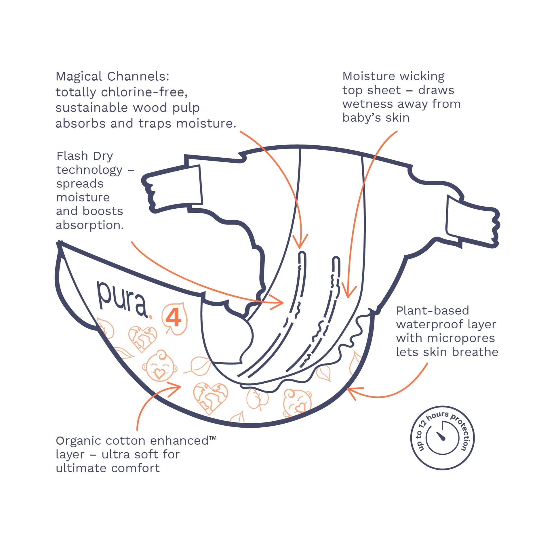 • GOOD FOR THE PLANET: Pura’s diapers are manufactured in a carbon neutral plant, powered by green electricity. Where possible, we’ve replaced non-sustainable materials with lower impact materials such as wood pulp from sustainably managed forests in the absorbent core of our diapers. Our packaging is made from paper, so it's easier to recycle!