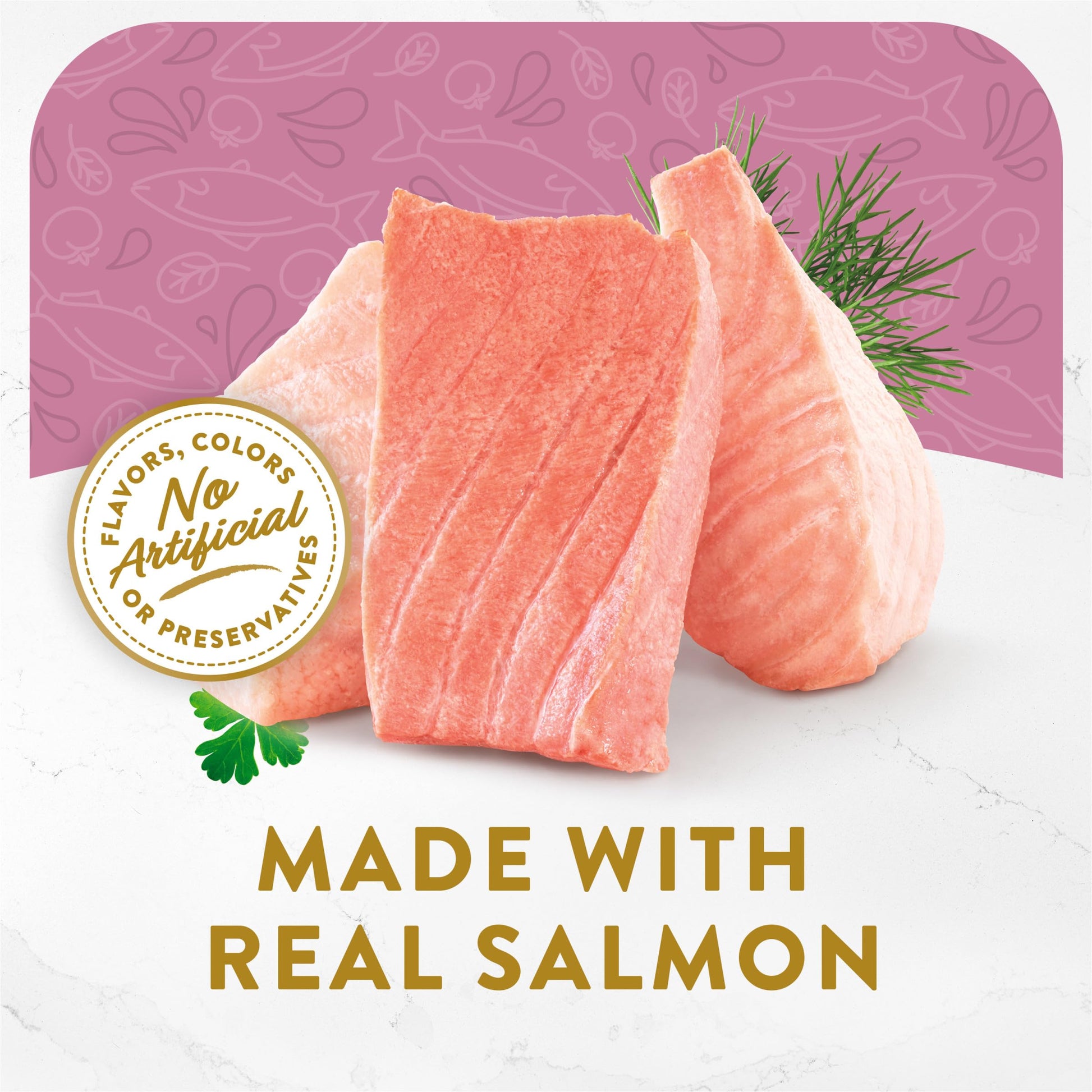 • Tender high protein lickable adult cat food treats complement made with real, high-quality salmon and vegetables in a silky, decadent broth for added flavor and moisture