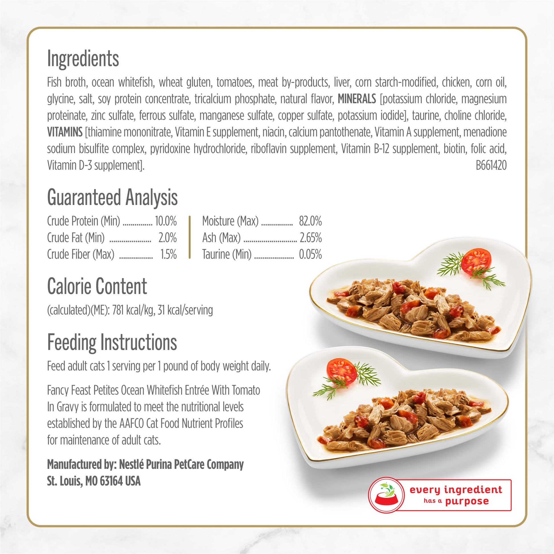 Details: Show your fancy feline how much she’s loved with the irresistible flavor of Purina Fancy Feast Petites Ocean Whitefish Entree With Tomato in Gravy gourmet wet cat food. Made by Fancy Feast, the number 1 cat food brand (as of April 2025 sales), each portioned tray breaks apart into two perfectly sized containers of blissfully delicious wet food for cats. Snap off a convenient, fuss-free tub to deliver just the right amount of gravy cat food to her dish. With no mess, no leftovers, and one more gourmet serving for the next meal, all that’s left to do is throw away the empty tub and get back to spending time with your favorite feline. Each serving of Fancy Feast Petites in gravy cat food is made with classy cats like yours in mind and has no artificial preservatives or colors. Plus, we craft this entree in cat gravy with real ocean whitefish with real tomatoes for the enticing taste and texture to keep her engaged with every bite. Serve a gourmet dish of Purina Fancy Feast Petites wet cat food and delight your furry connoisseur’s senses with the purr-worthy fish flavor she’s been waiting for.
