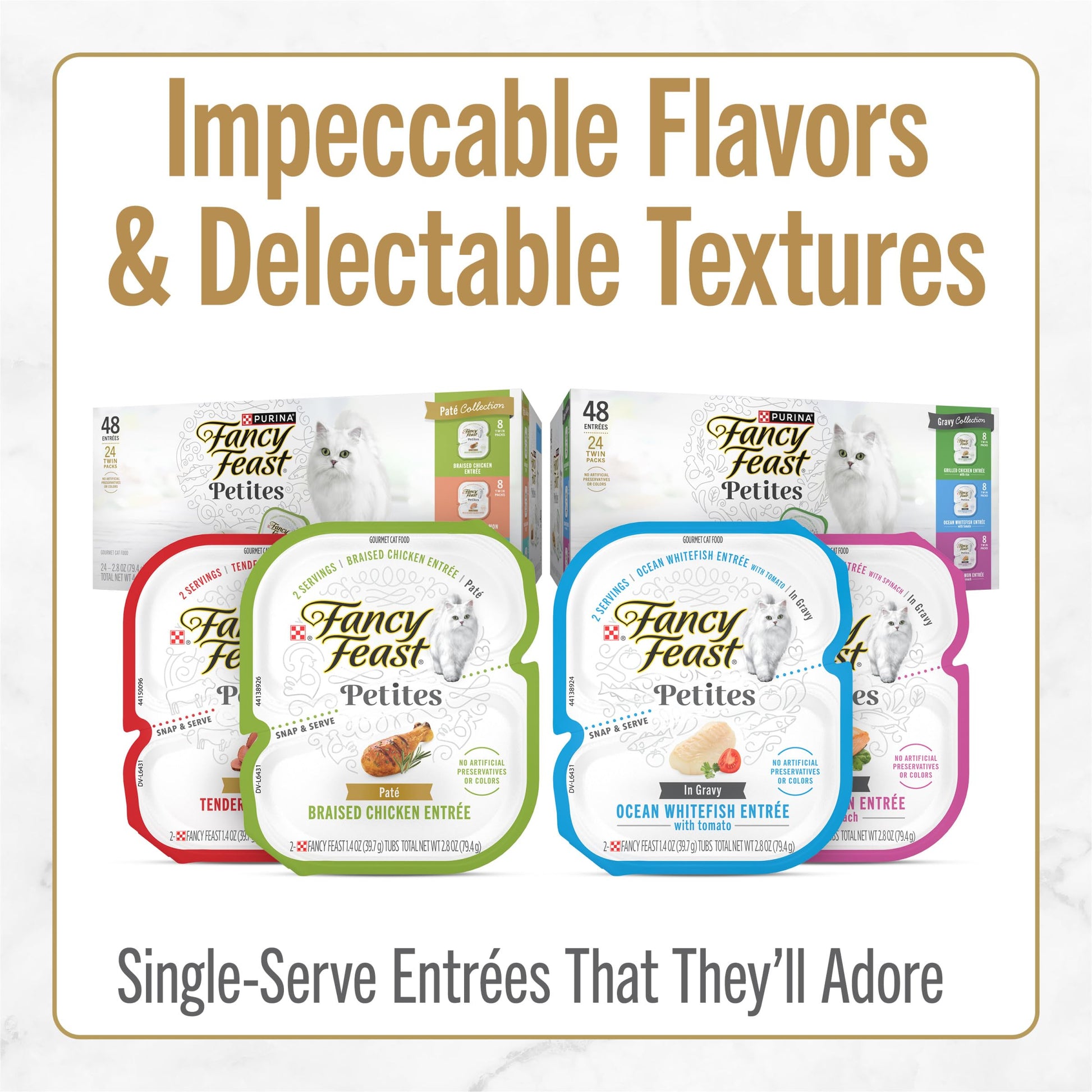 • DELIGHTFUL TASTE AND TEXTURE: Fancy Feast Petites adult cat food offers a delicious taste in two convenient snap-apart single-serve tubs.