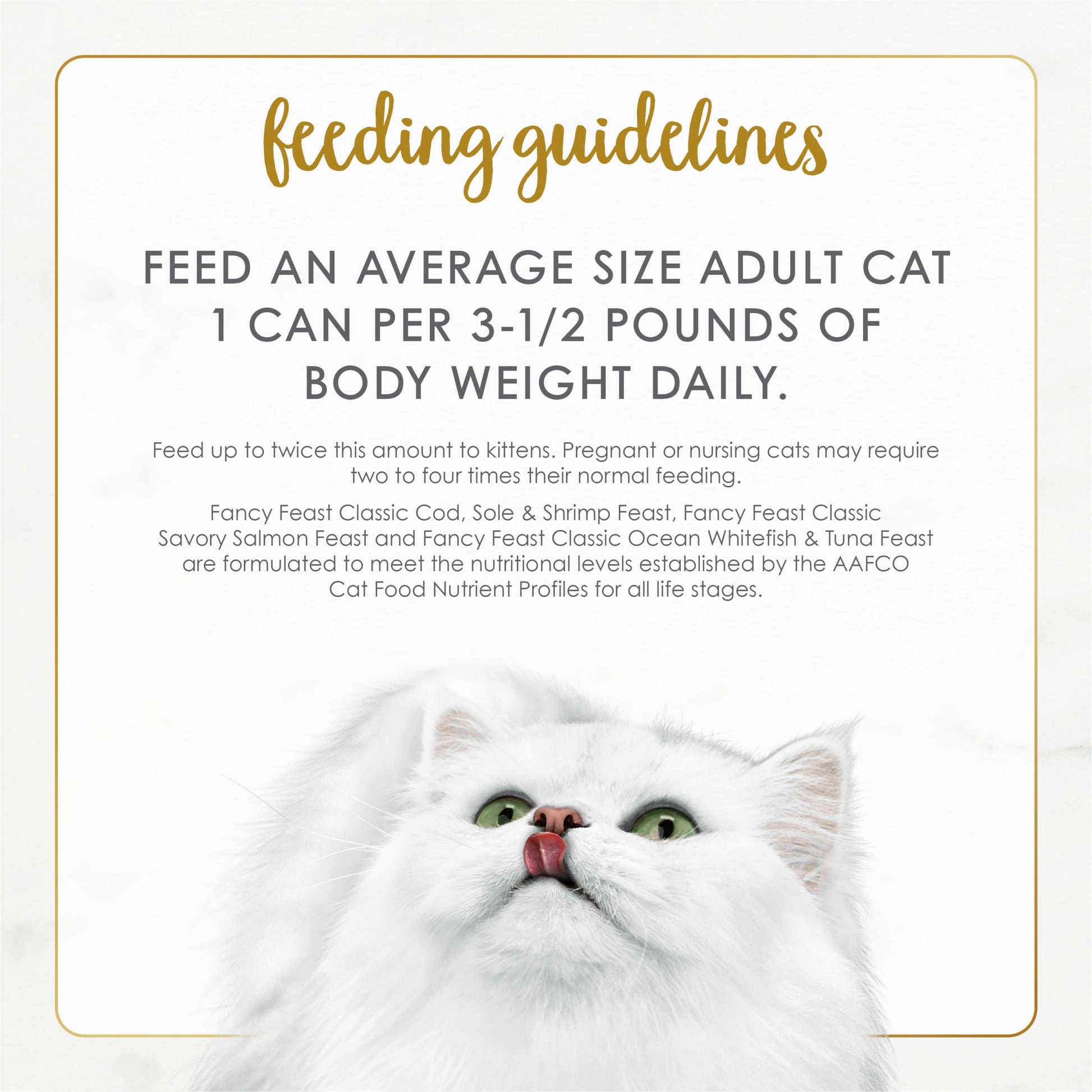 Details: Bring the tastes of the ocean to your cat's dish with Purina Fancy Feast Classic Seafood Feast Collection cat food. This soft cat food variety pack features a tasty assortment of cat food entrees, made with real fish and seafood, to satisfy her cravings for flavor. The smooth pate texture is pleasing to her palate, and the high-quality canned cat food recipes let you feel good about filling her dish. With essential vitamins and minerals to support her overall health, this wet cat food variety pack makes it easy to care for your cat's nutritional needs. The unmistakable aroma is sure to get her attention every time you open a can, and the mouthwatering taste is sure to have her running to her dish at mealtime. Offer up a different flavor at every feeding, and rest easy knowing she's getting 100 percent complete and balanced nutrition in her bowl. Your favorite feline loves you just like you love her. Keep that love growing with an order for this Purina Fancy Feast wet cat food collection.