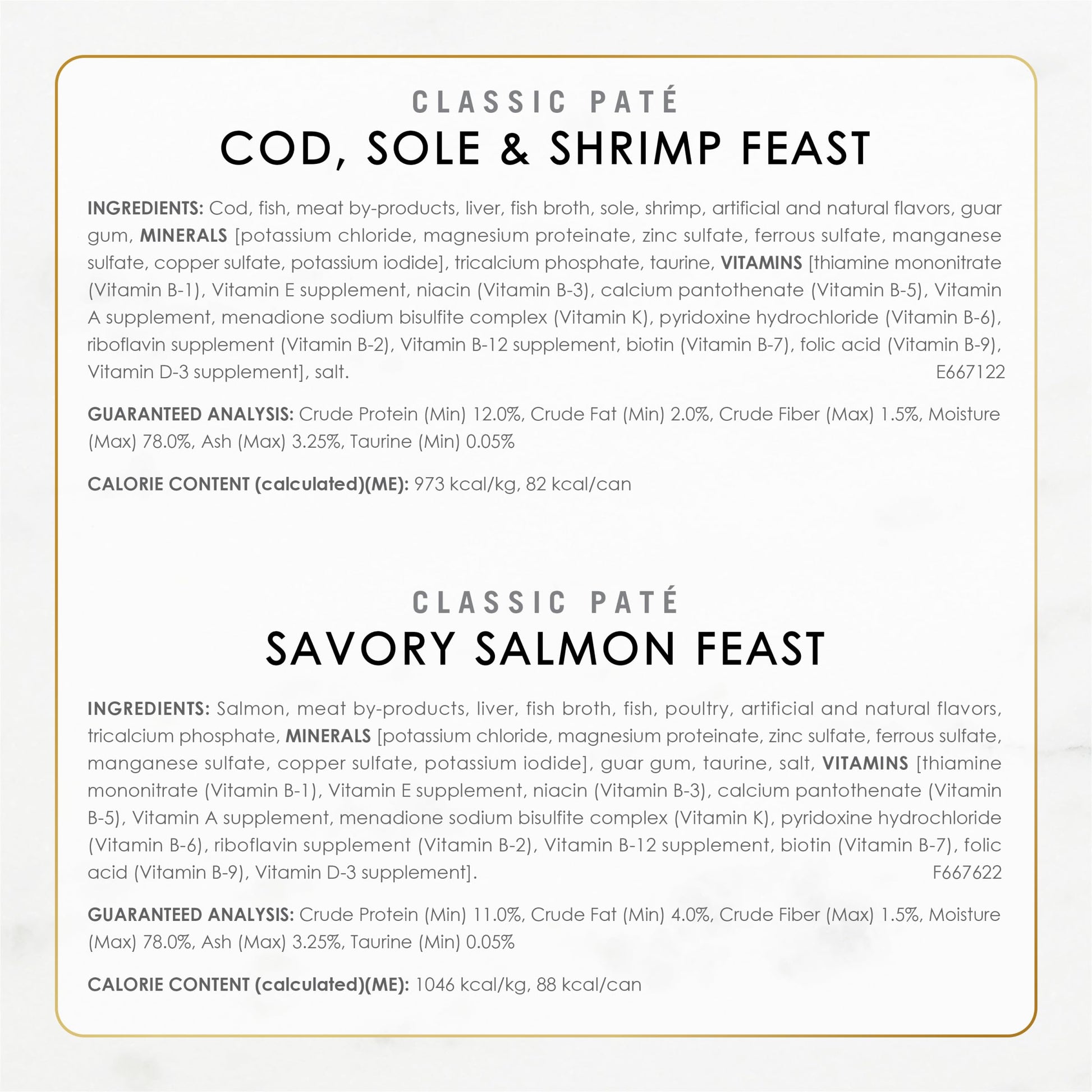 • Canned cat food variety pack featuring Cod, Sole and Shrimp, Savory Salmon or ocean whitefish and tuna as the number one ingredient