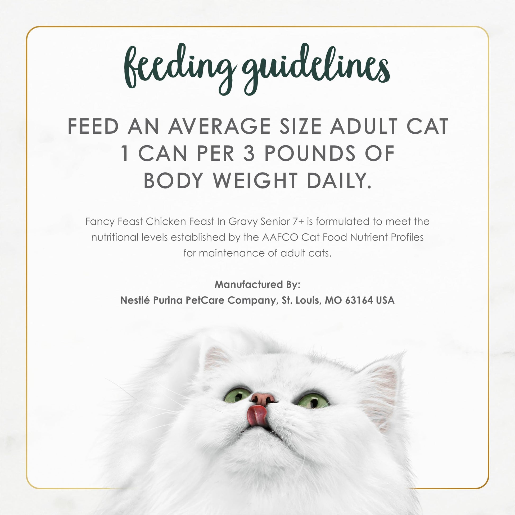 Details: Nourish your senior cat and tempt her taste buds by filling her dish with Purina Fancy Feast Chicken Feast Minced in Gravy Senior 7+ adult wet cat food. This delicious chicken canned cat food recipe is specially formulated to meet your senior cat's unique nutritional needs and support her overall health. Our senior cat food formula contains taurine, an essential amino acid for cats, as well as antioxidants for immune support and high levels of vitamin E to provide the essential nutrients she needs to thrive in her golden years. The high protein cat food formula helps keep her muscles strong, so she can stay active throughout her senior years. Each delectable serving of this minced chicken cat food offers your 7+ year old adult cat 100 percent complete and balanced nutrition along with the exceptional Fancy Feast taste she loves. Delight your favorite feline with the gourmet goodness found in every pull-tab can of Purina Fancy Feast wet cat food.